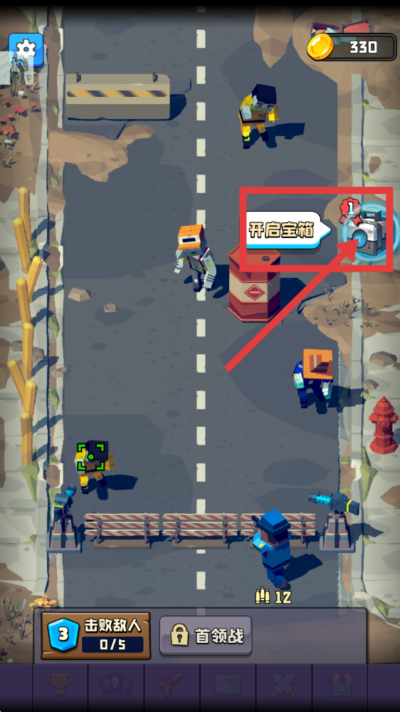 4、金币达【330】时,点击【开启宝箱】获取奖励,同时开启新的【击败敌人-0/5】关卡,继续推进。
