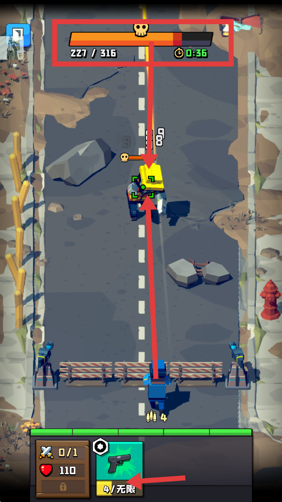 3、首领战中,留意首领血量【227/316】和时间【0:36】,使用【无限-手枪】持续攻击,争取快速击败。