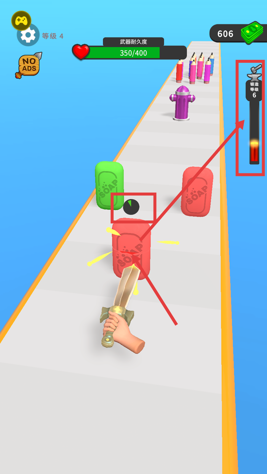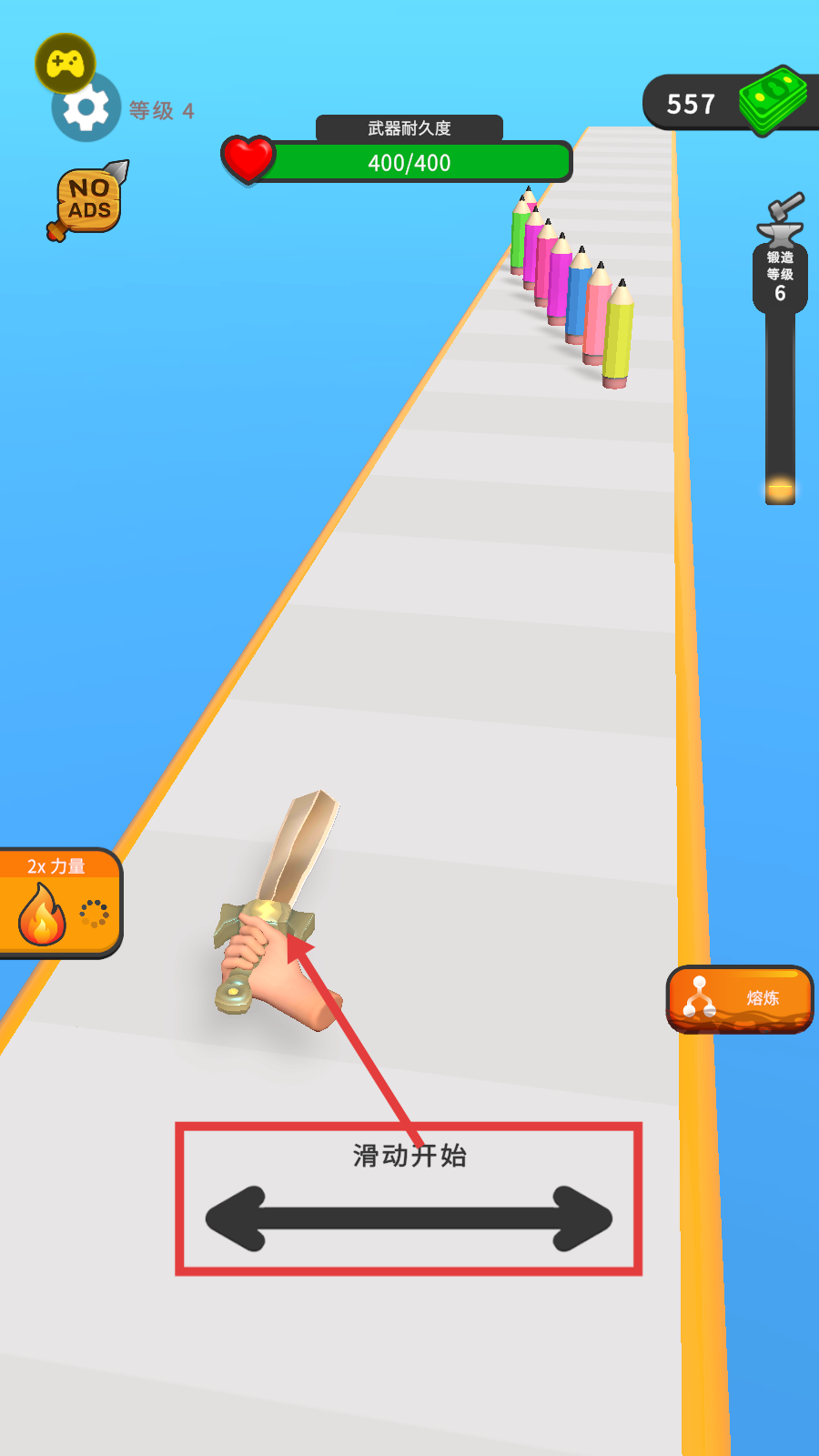 1、等级4,【武器耐久度-400/400】,滑动开始闯关,面对彩色铅笔障碍,开启关卡进程。