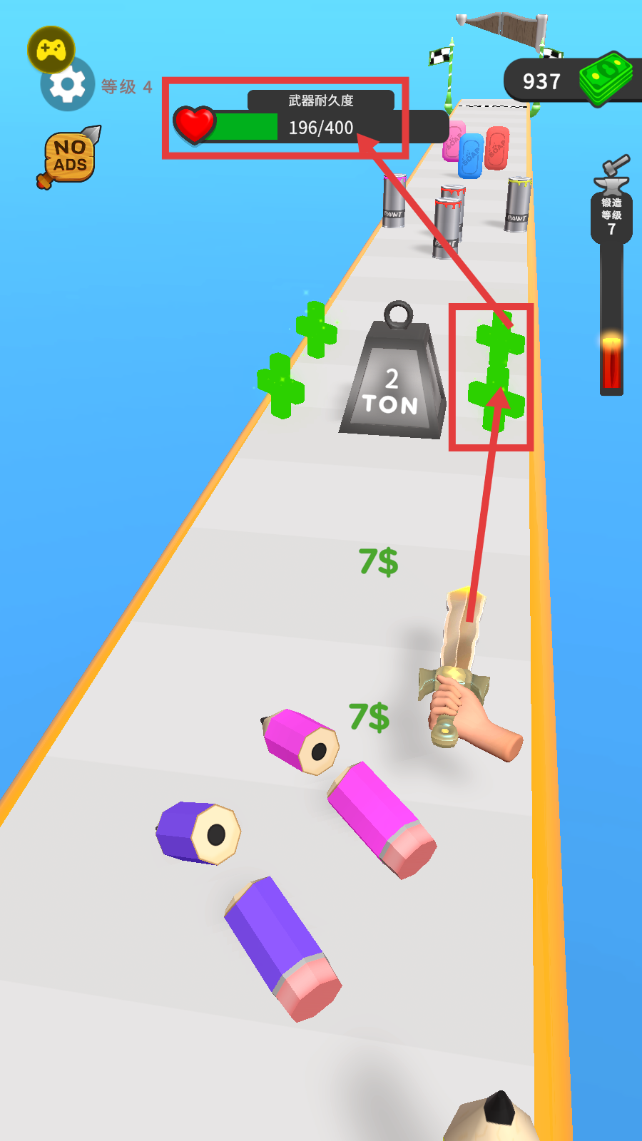 3、【武器耐久度-196/400】,锻造等级7,击碎绿色十字道具,补充资源并推进关卡。
