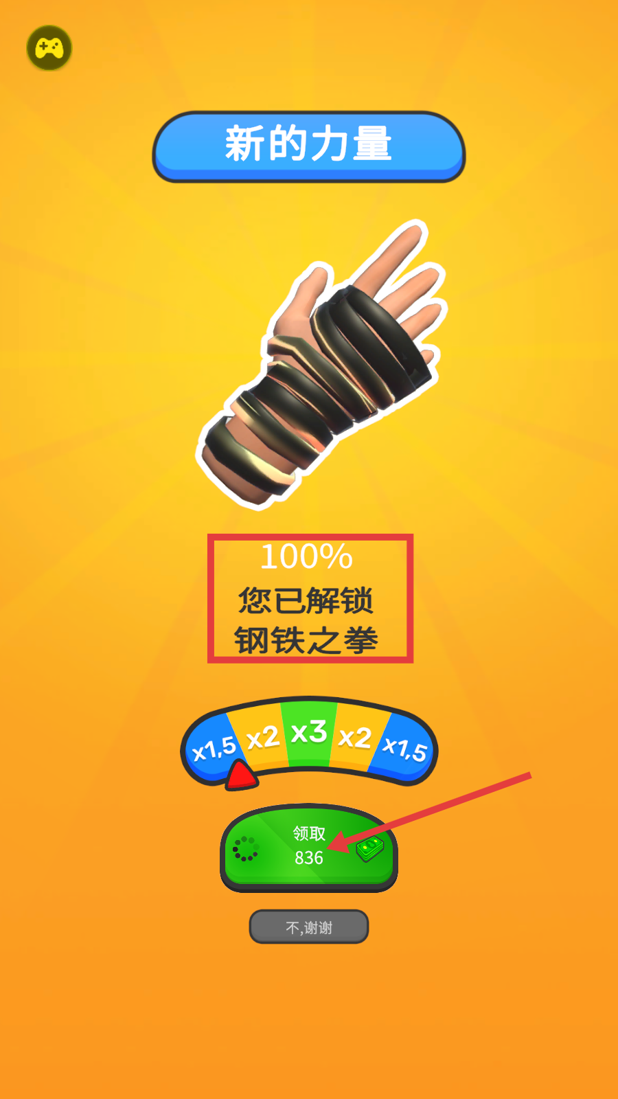 4、解锁【钢铁之拳-100%】,点击领取【836】奖励,获得新力量助力后续闯关。