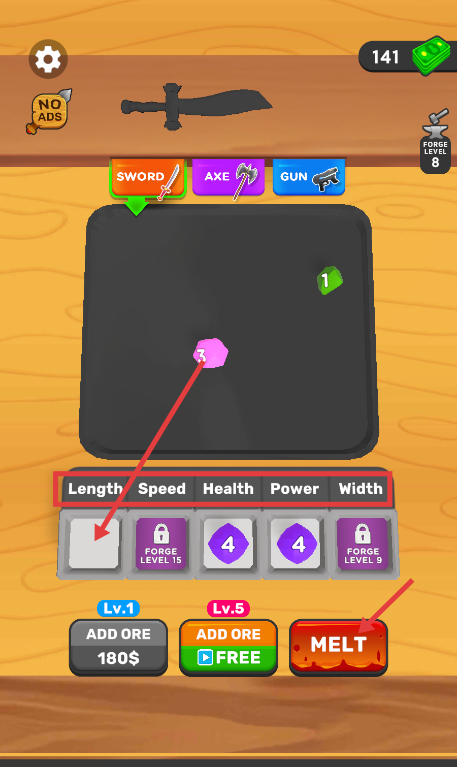 1、锻造等级8,选择【SWORD】,添加矿石后点击【MELT】,强化武器的【Length】等属性,为闯关奠基。