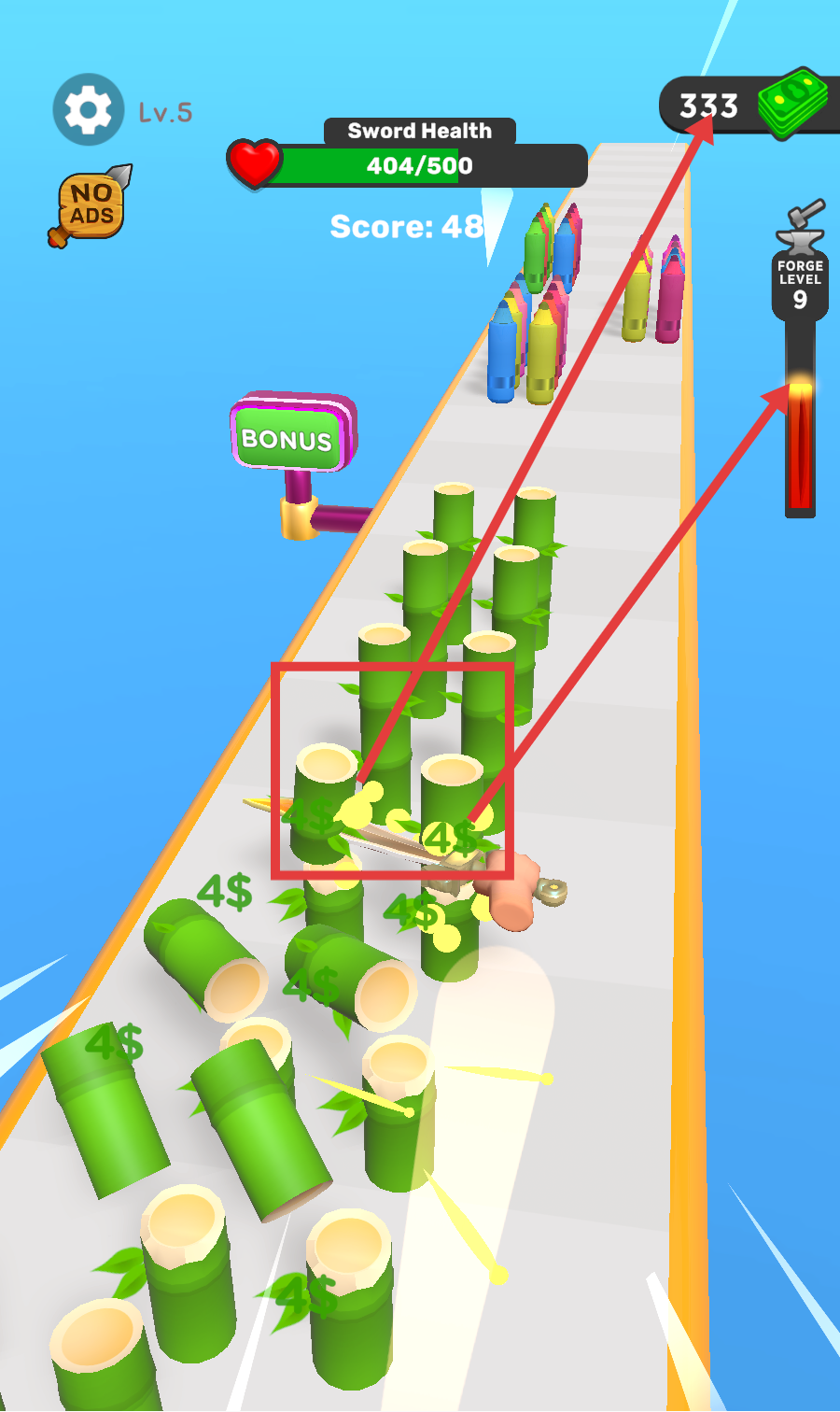 4、【SwordHealth-404/500】,锻造等级9,击碎竹子获取【4-美元】,金币达333,推进关卡同时积累资源。