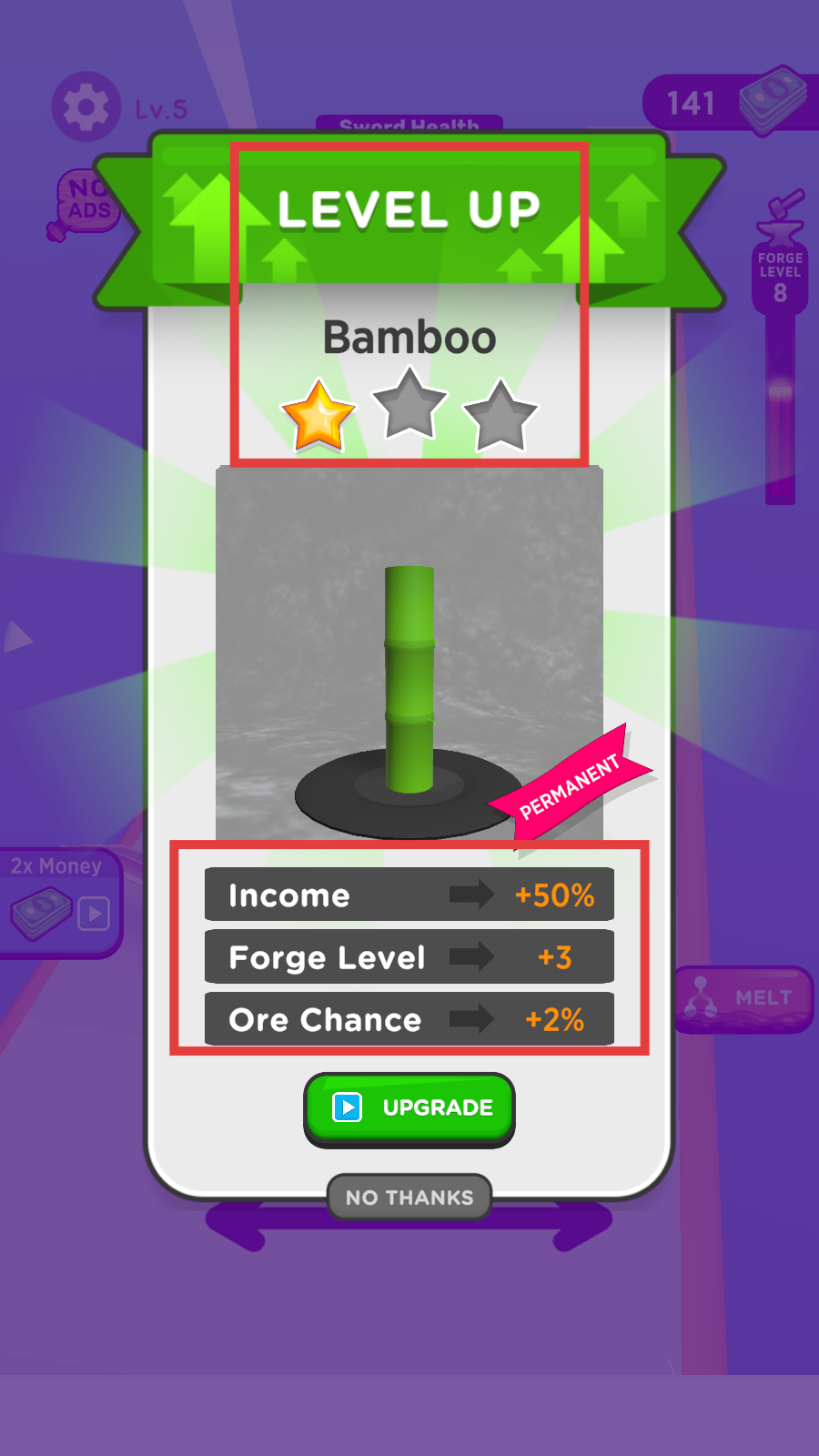3、【LEVELUP-Bamboo】,提升【Income-+50%】【ForgeLevel-+3】【OreChance-+2%】,加速资源与锻造等级成长。