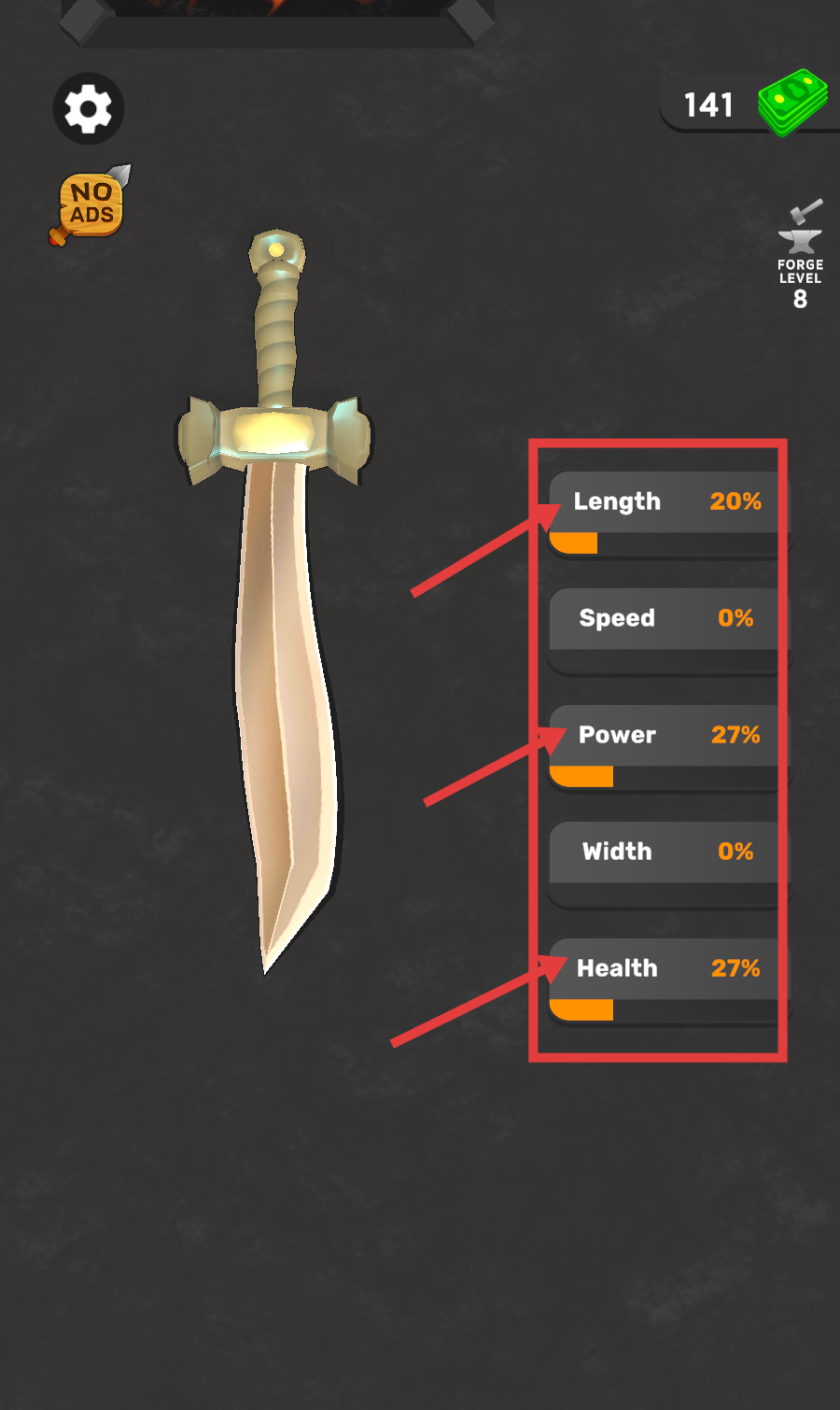 2、查看武器属性,【Length-20%】【Power-27%】【Health-27%】,属性强化后战力显著提升,可应对更强障碍。