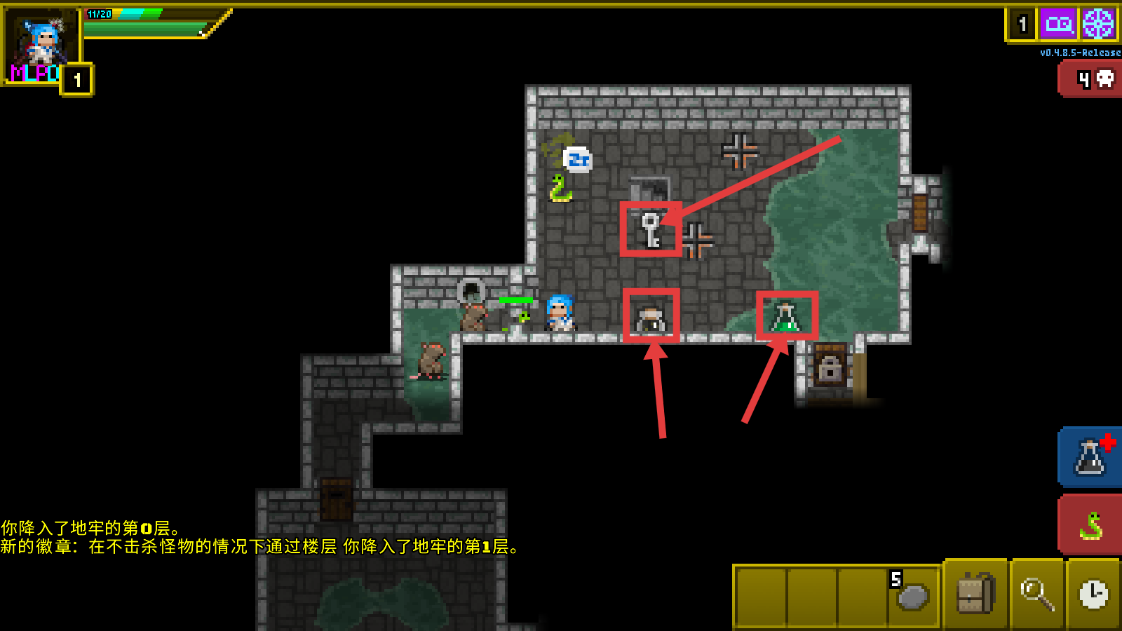2、地牢第0层,留意【16/20-生命值】,躲避老鼠和蛇类怪物,谨慎探索避免受伤。