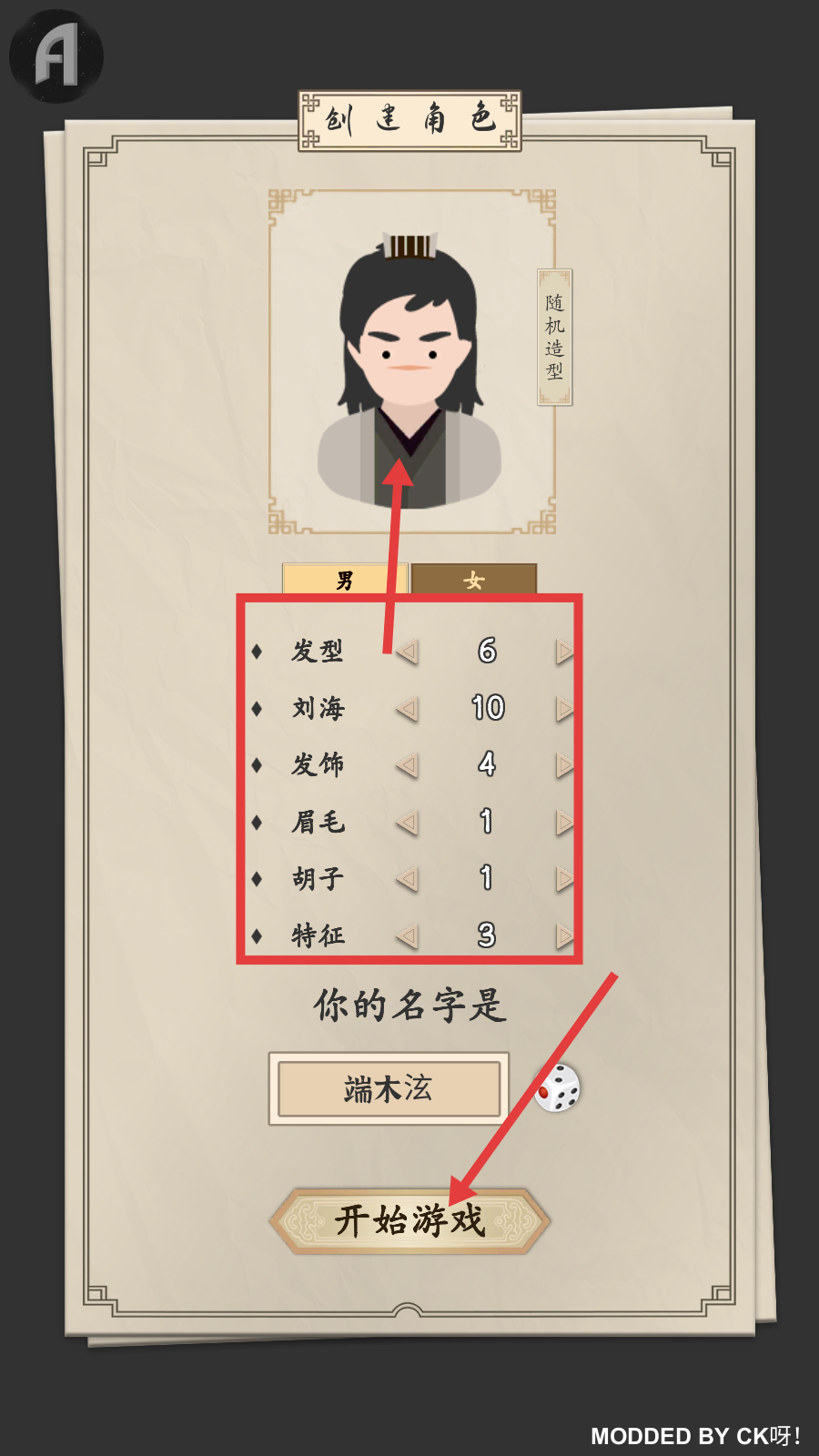 2、在【创建角色】界面,可调整【发型】【刘海】等外观参数,确认名字后点击【开始游戏】进入江湖。