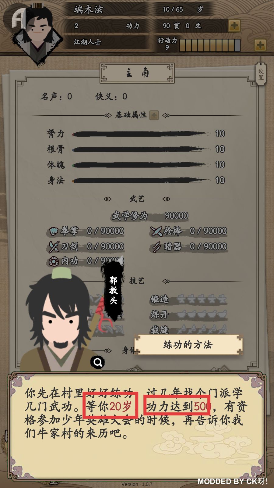3、按照郭教头指引,在村里好好练功,目标【20岁】时【功力达到500】,以便参加少年英雄大会。