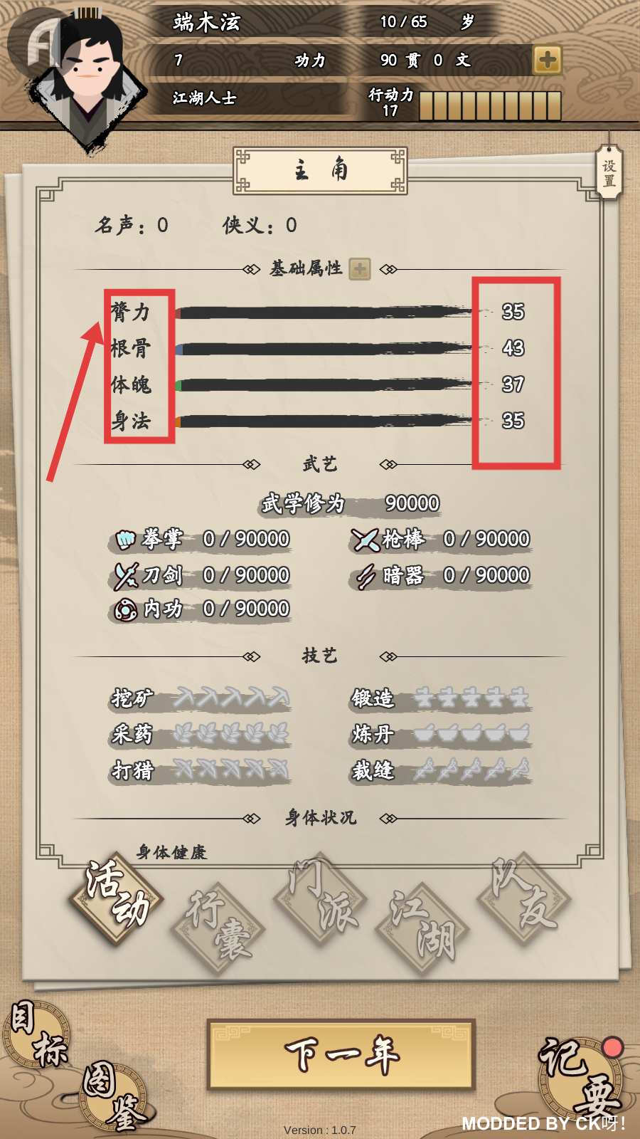 4、关注基础属性【膂力】【根骨】【体魄】【身法】的提升,这些属性对武功修炼和江湖发展至关重要。