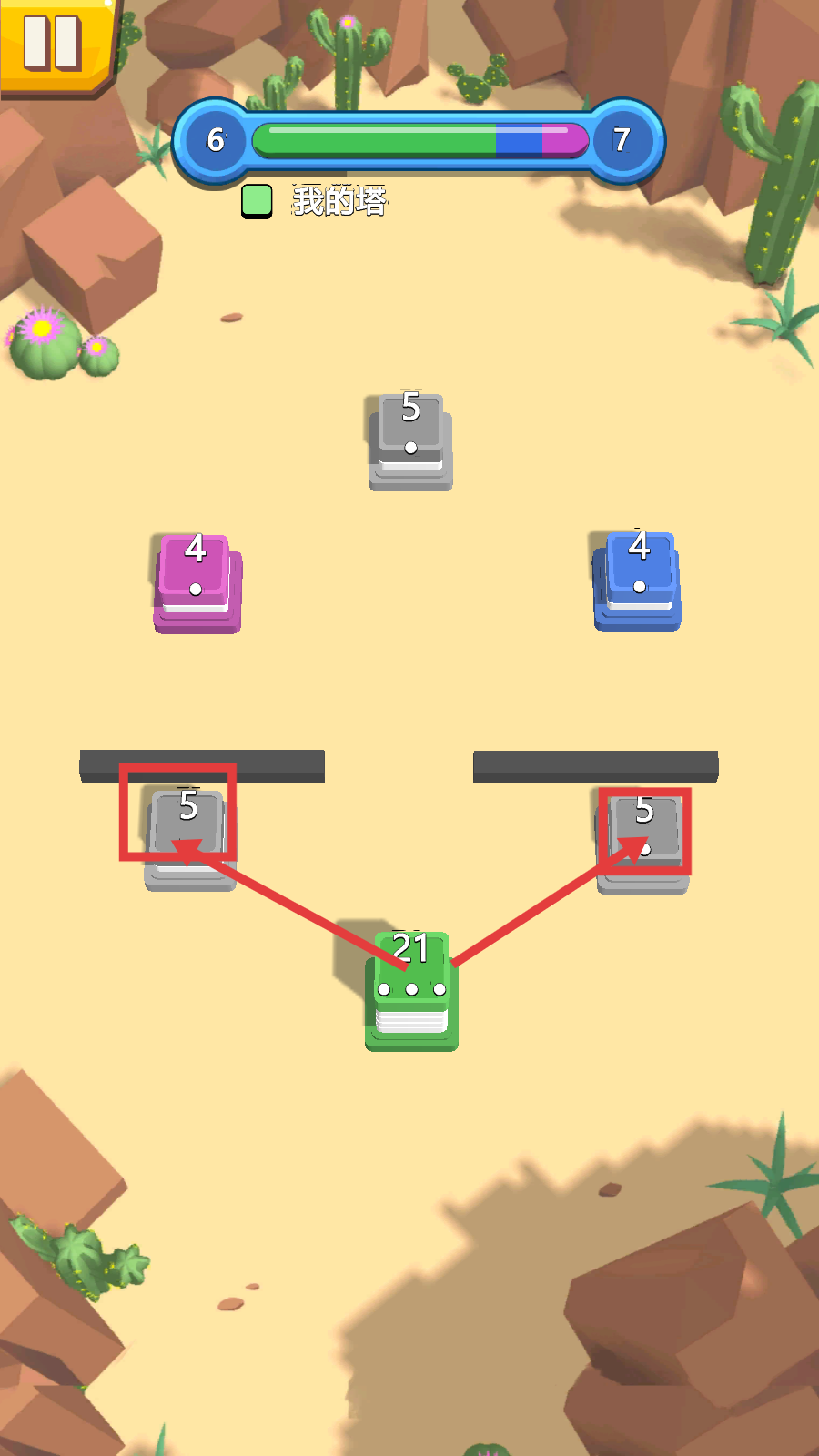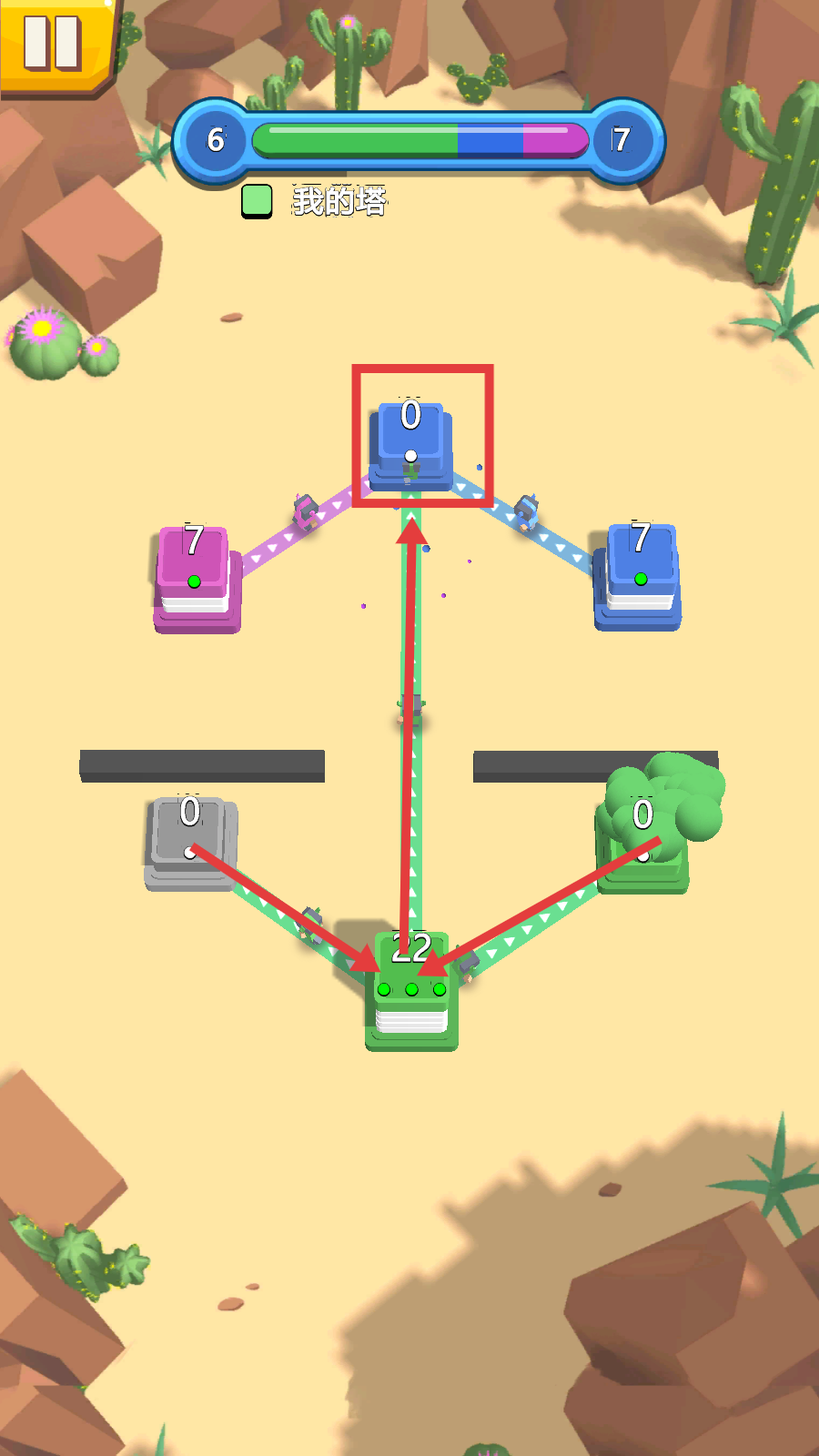 1、优先选择高数值己方塔(如21塔)攻击低数值敌方塔(如5塔),利用数值差距快速削减敌方塔数值,抢占开局优势。