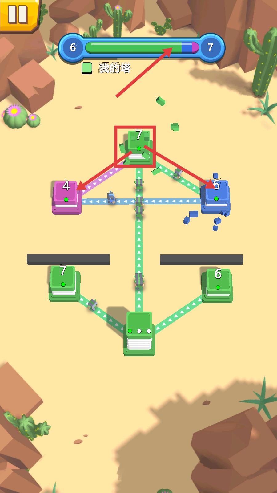 3、联合多个己方塔(如7、4、6塔)协同进攻,快速推进“我的塔”进度条,加速战局进程。
