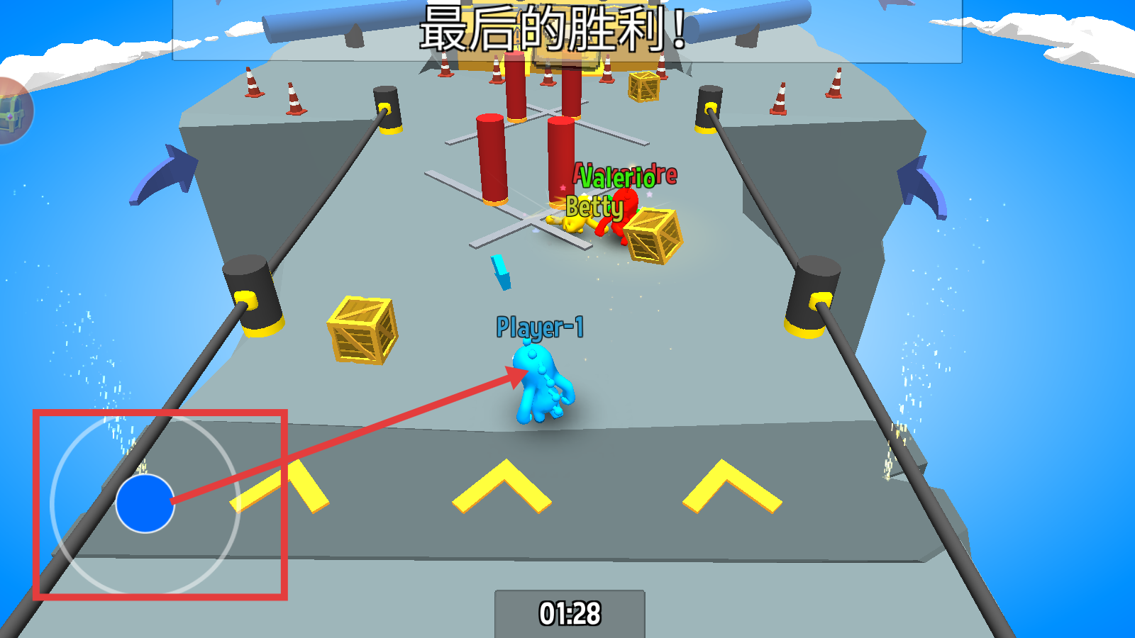 2、游戏中通过左侧摇杆控制角色【Player-1】移动,在场景中灵活走位,参与“最后的胜利”主题战斗。
