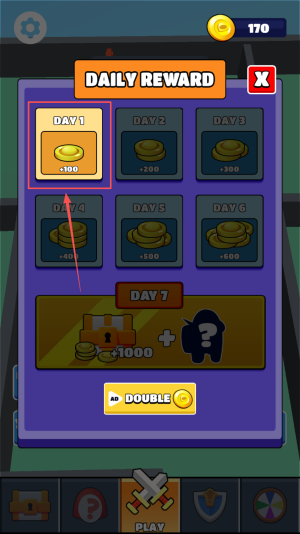 1、首先,在每日奖励界面点击“PLAY”领取基础奖励,想翻倍再点“AD DOUBLE”看广告。
