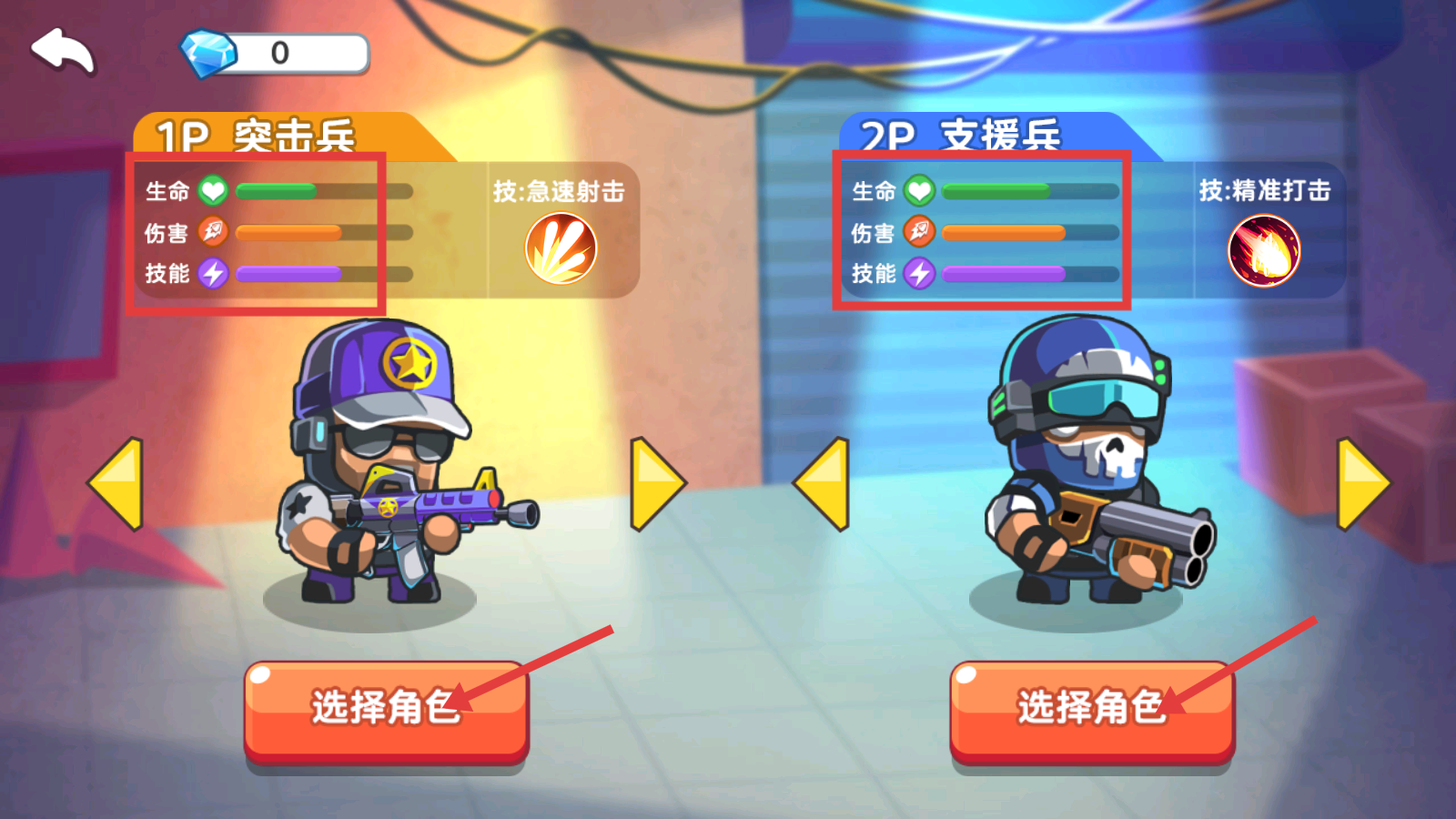 2、选择角色时,【突击兵-急速射击】适合快速输出,【支援兵-精准打击】擅长精准攻击,可根据战斗风格选择角色。