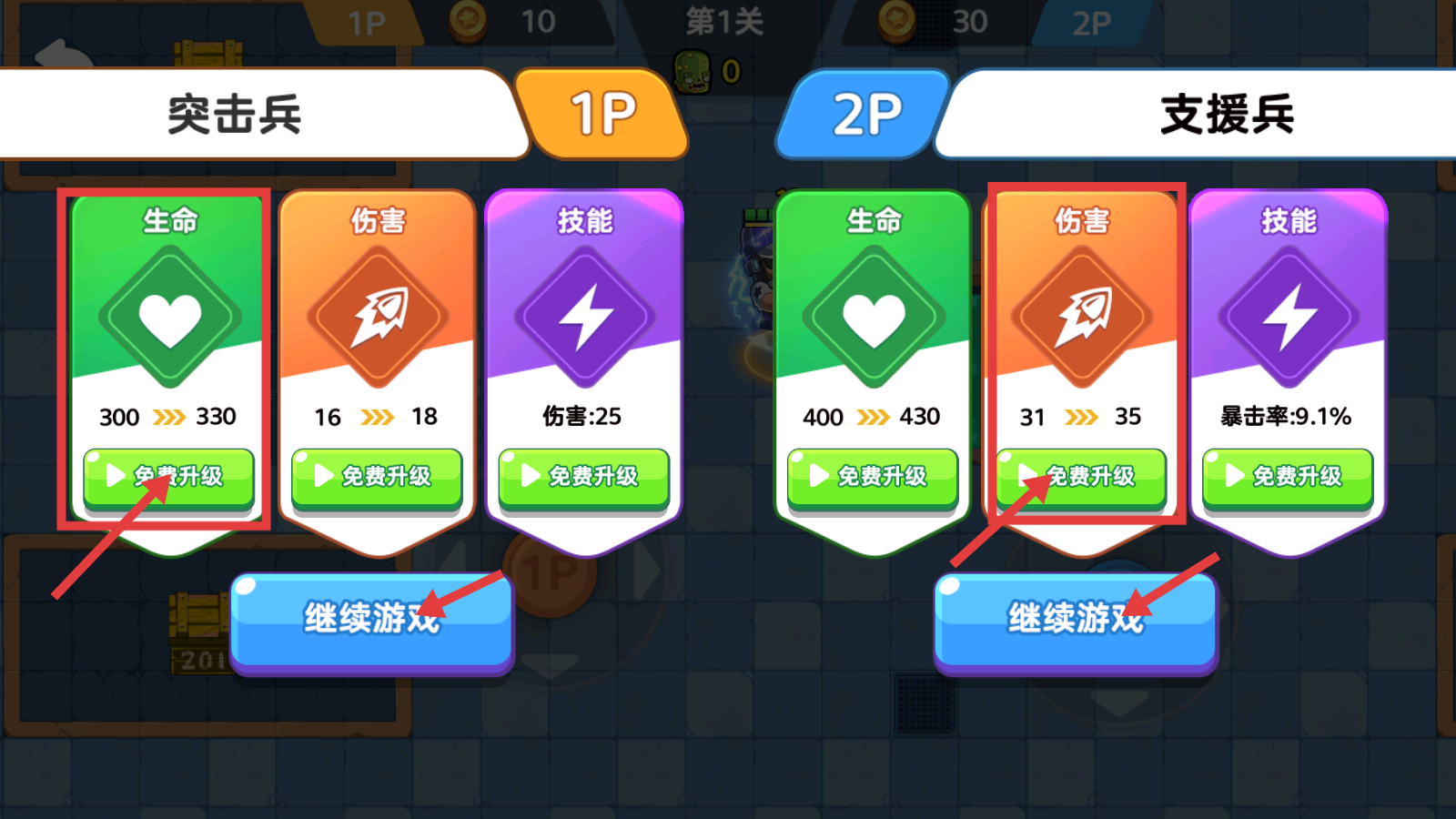 4、通关后及时升级【突击兵-生命】【支援兵-伤害】等属性,提升战力后点击继续游戏,战力越强后续通关越轻松。