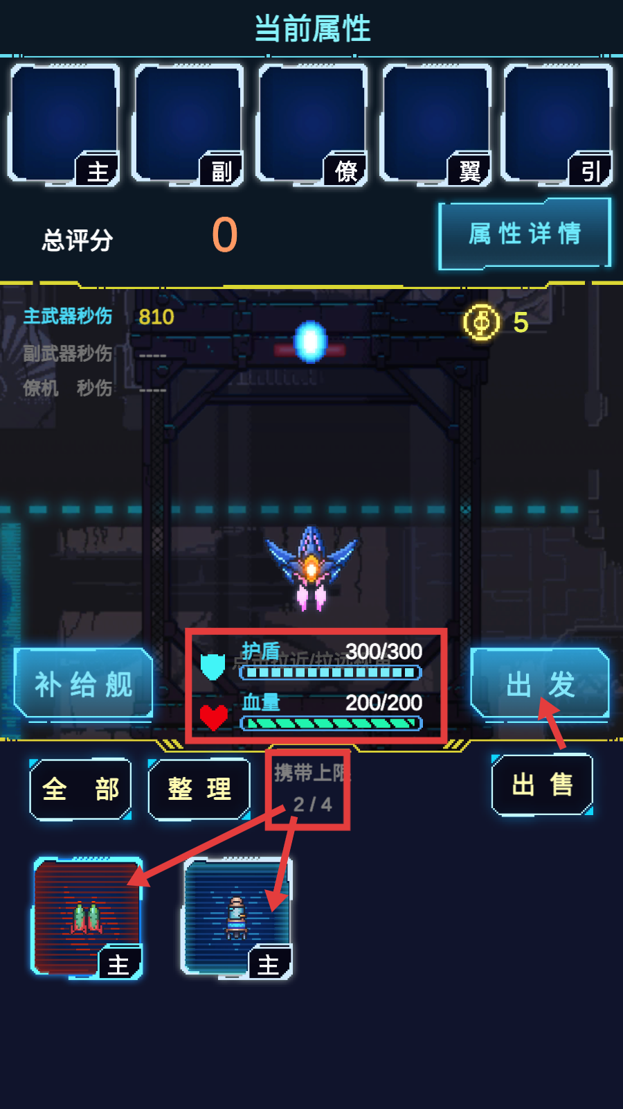 4、查看【当前属性-护盾300/300-血量200/200】,合理搭配武器,点击【出发】开启新关卡。