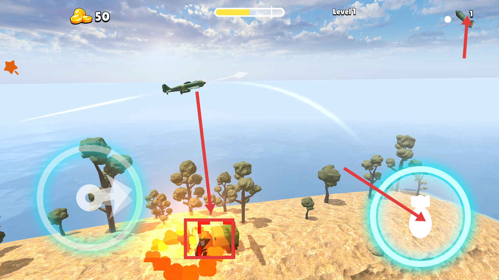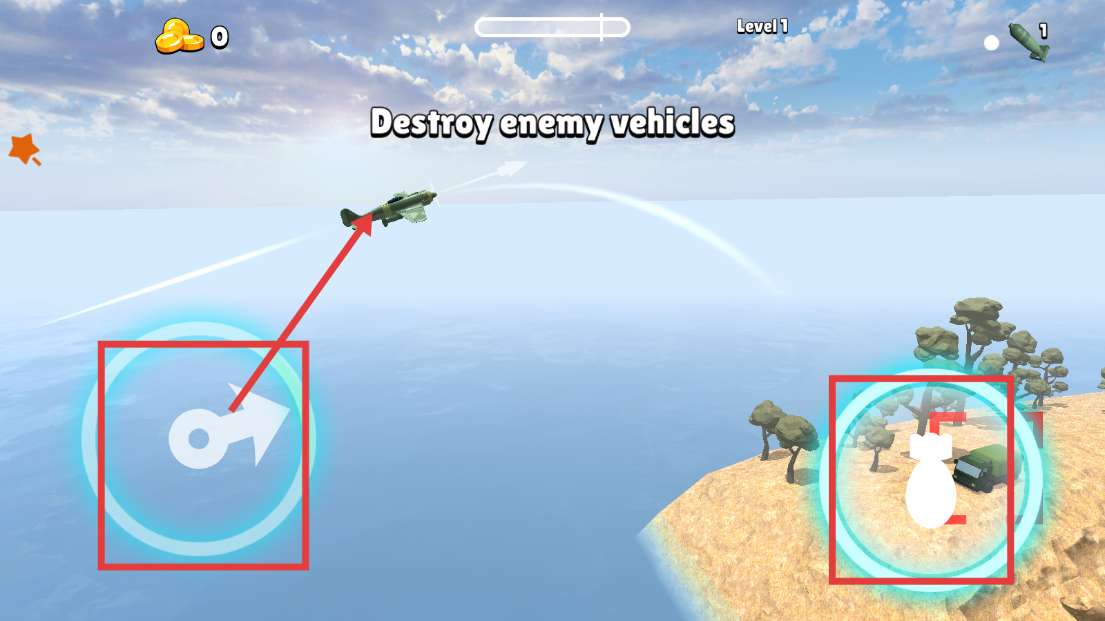 1、操控飞机移动,执行【Destroy-enemy-vehicles】任务,点击投弹按钮瞄准敌方车辆,开启战斗。