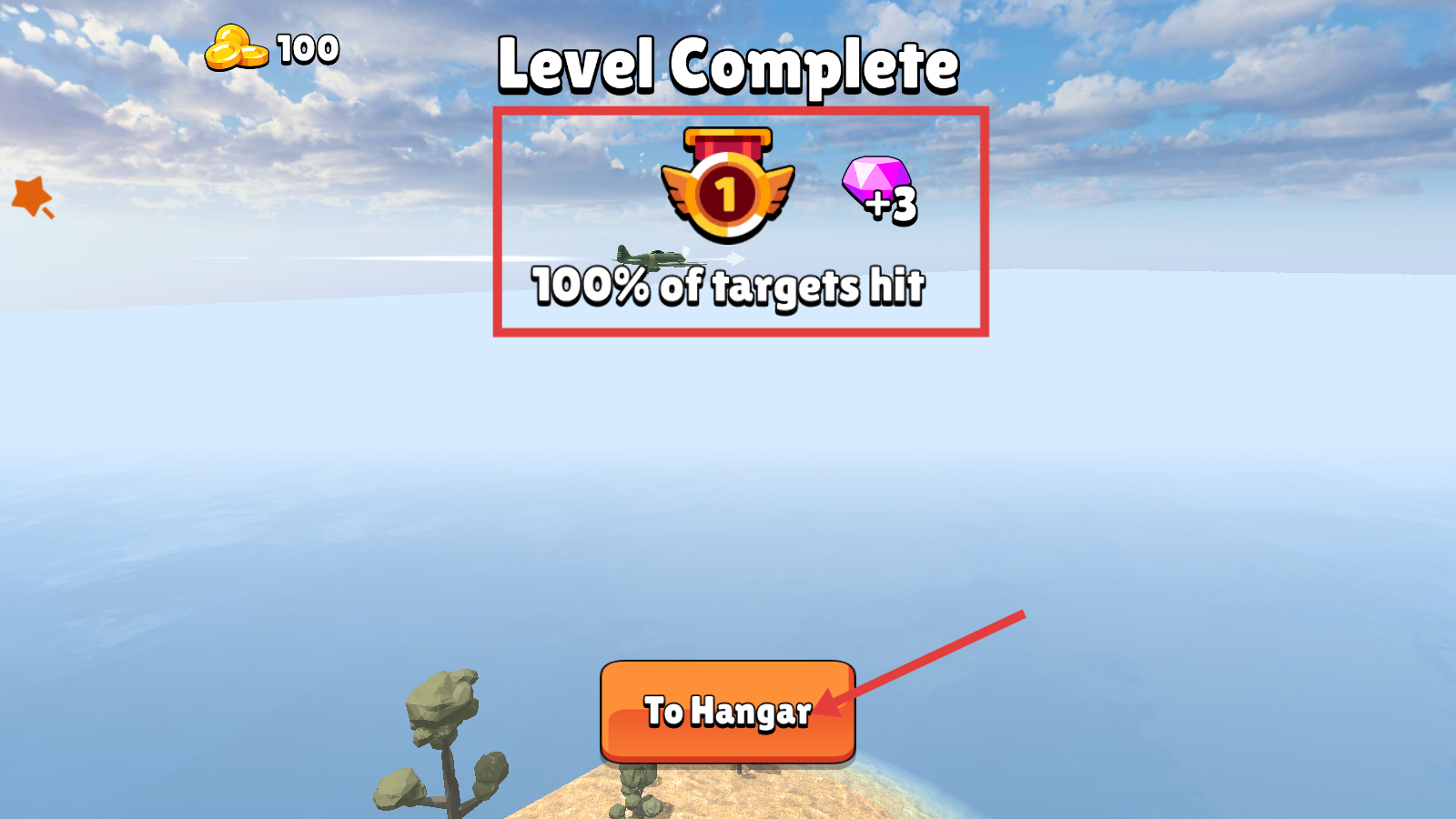 4、完成关卡后获得【Level-Complete】奖励,含钻石与勋章,点击【To-Hangar】进入机库,备战下一关。