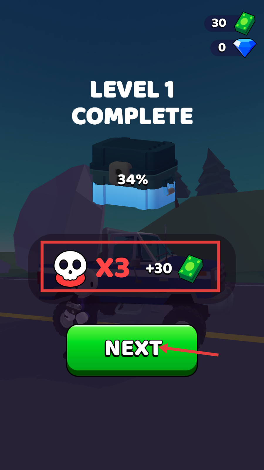 4、完成【LEVEL-1-COMPLETE】后,获取奖励,点击【NEXT】进入下一关,继续挑战。