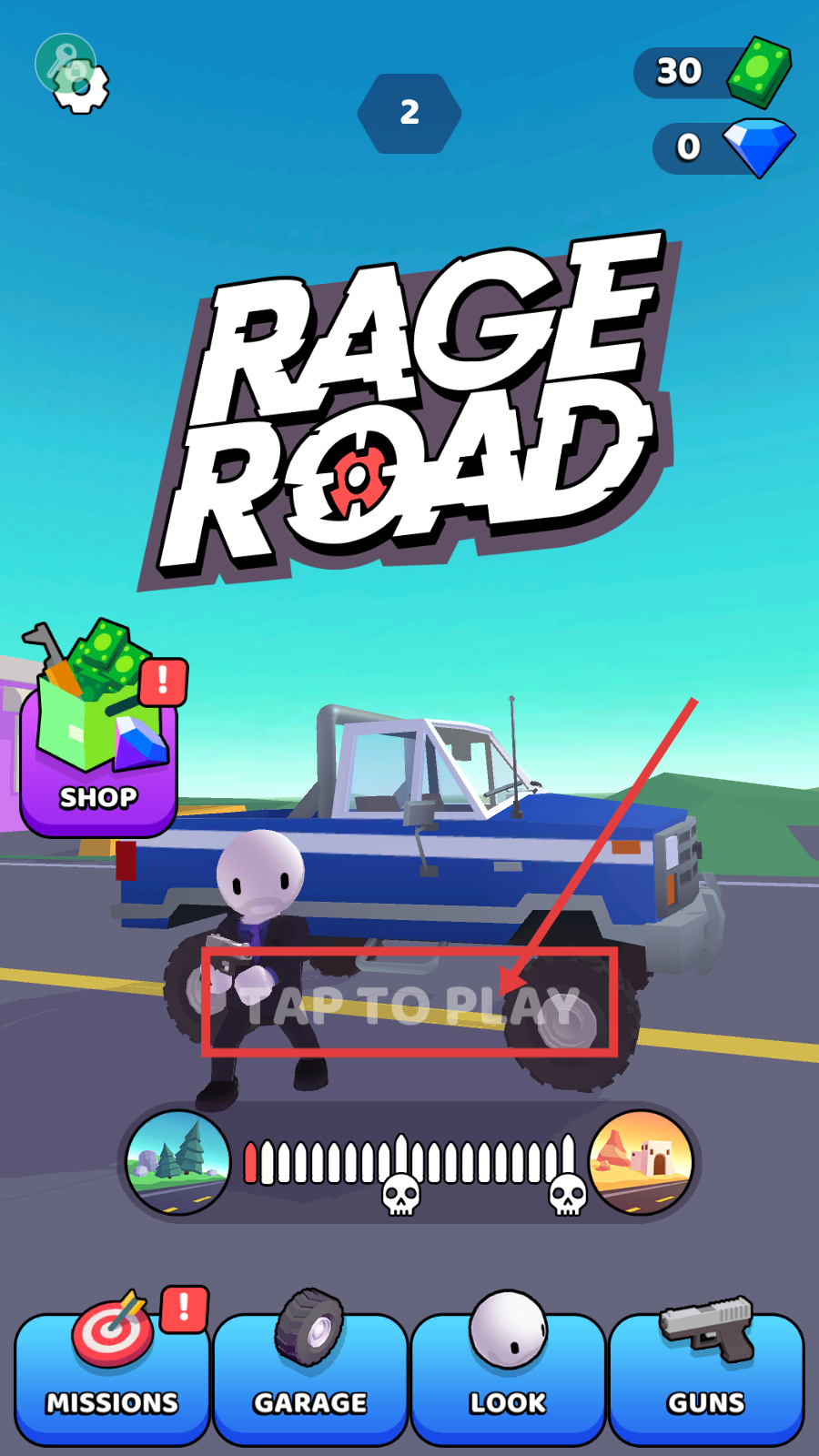 1、点击【TAP-TO-PLAY】开始游戏,了解【RAGE-ROAD】界面功能,熟悉后开启战斗。