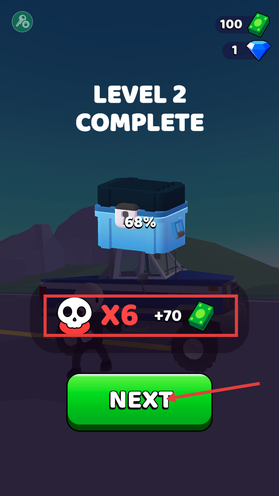 4、完成【LEVEL-2-COMPLETE】后,获取奖励,点击【NEXT】进入下一关继续挑战。