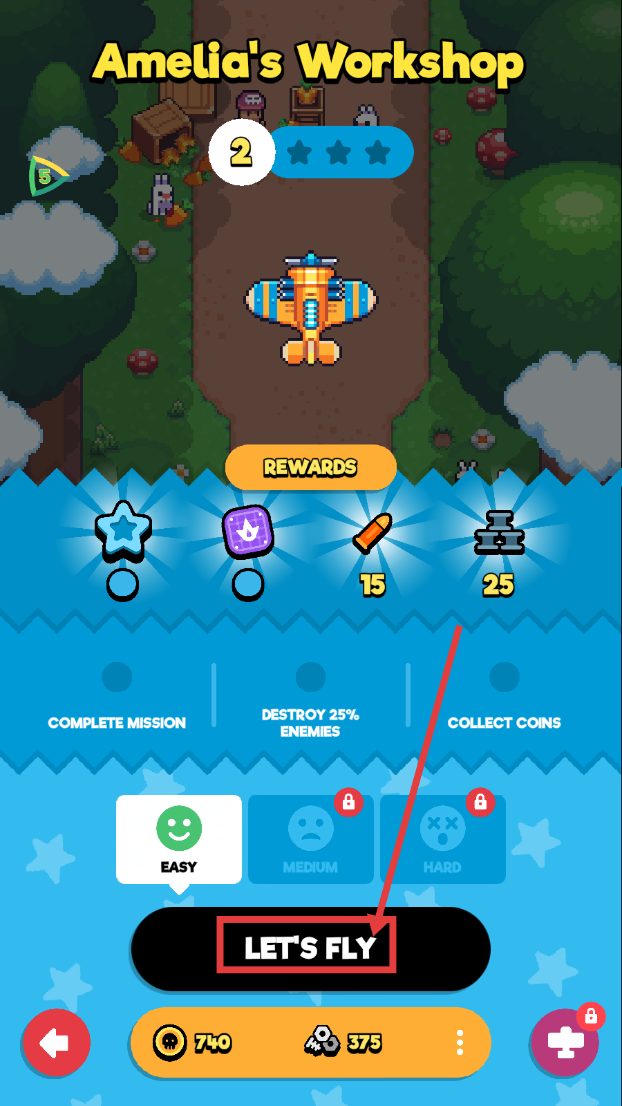1、在【Amelia's-Workshop】关卡2,点击【LET'S-FLY】开始,获取【星星-紫色道具-子弹15-零件25】奖励,开启战斗。