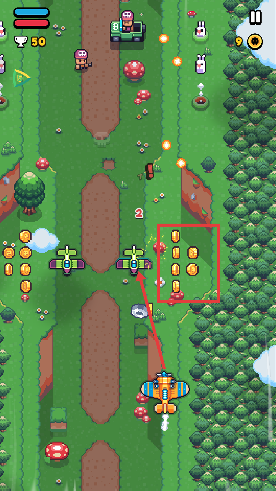 2、战斗中收集金币,瞄准敌方飞机打击,积累资源推进关卡。