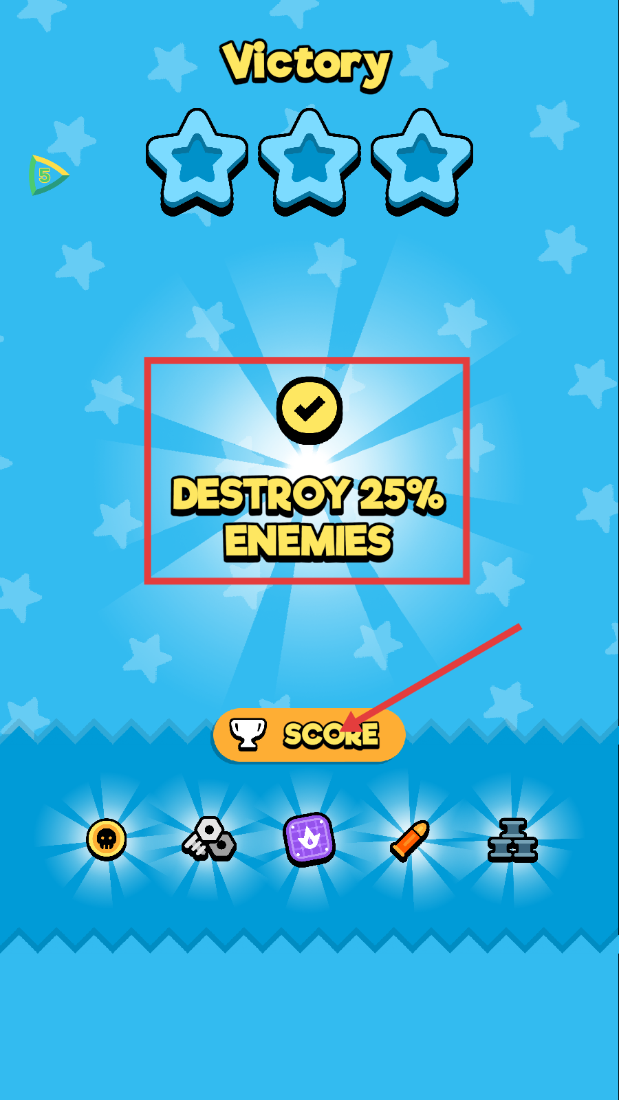 4、完成【Destroy-25%-Enemies】目标,获得胜利,点击【SCORE】查看奖励,积累资源备战下一关。