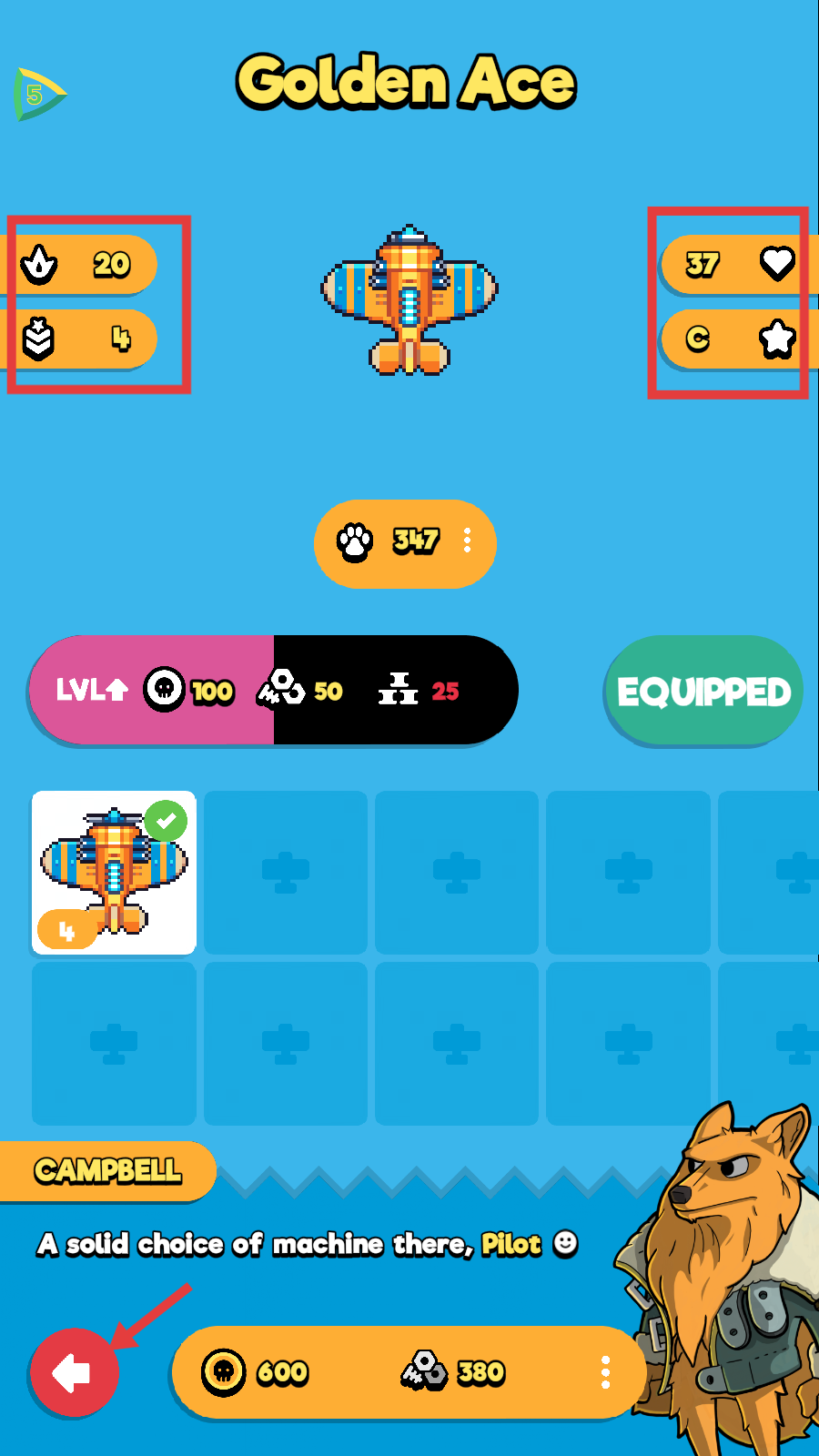 1、在【Golden-Ace】界面,查看飞机属性【火焰20-等级4-爱心37】,了解升级资源,为战斗做好准备。
