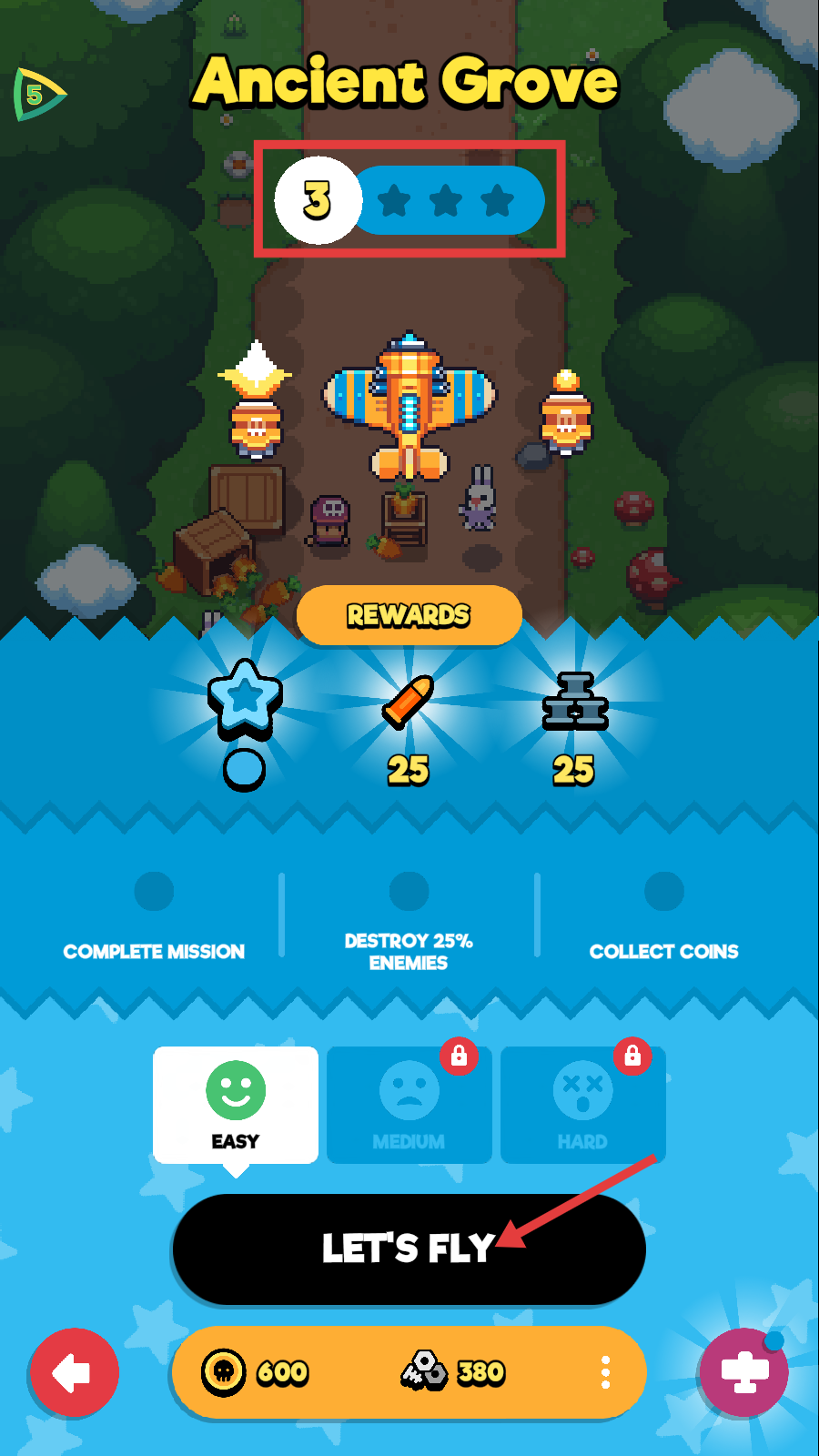 2、在【Ancient-Grove】关卡3,点击【LET'S-FLY】开始,获取【星星-子弹25-零件25】奖励,开启战斗。