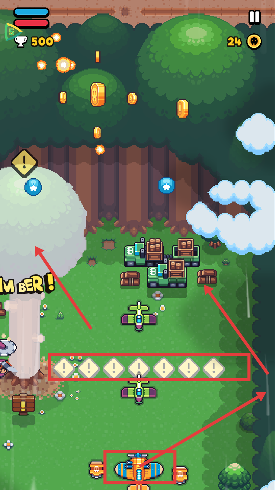 3、战斗中留意障碍物与敌方单位,收集金币,瞄准敌机打击,推进关卡。