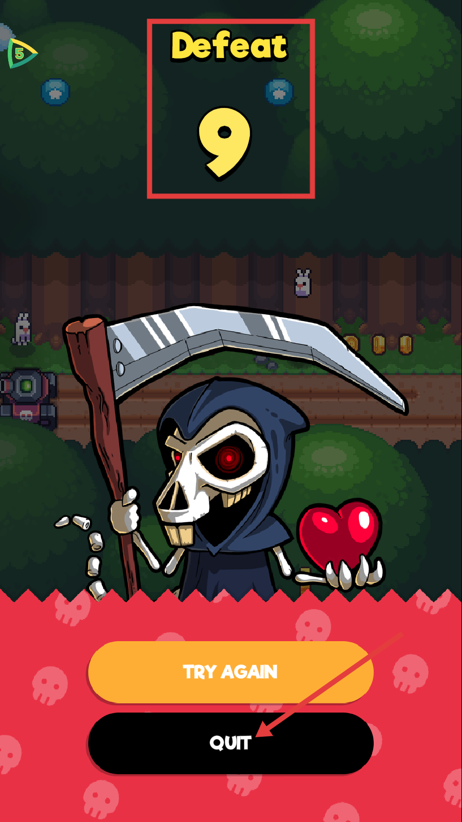 4、失败后出现【Defeat-9】界面,可选择【QUIT】,总结经验,积累资源后再次挑战。