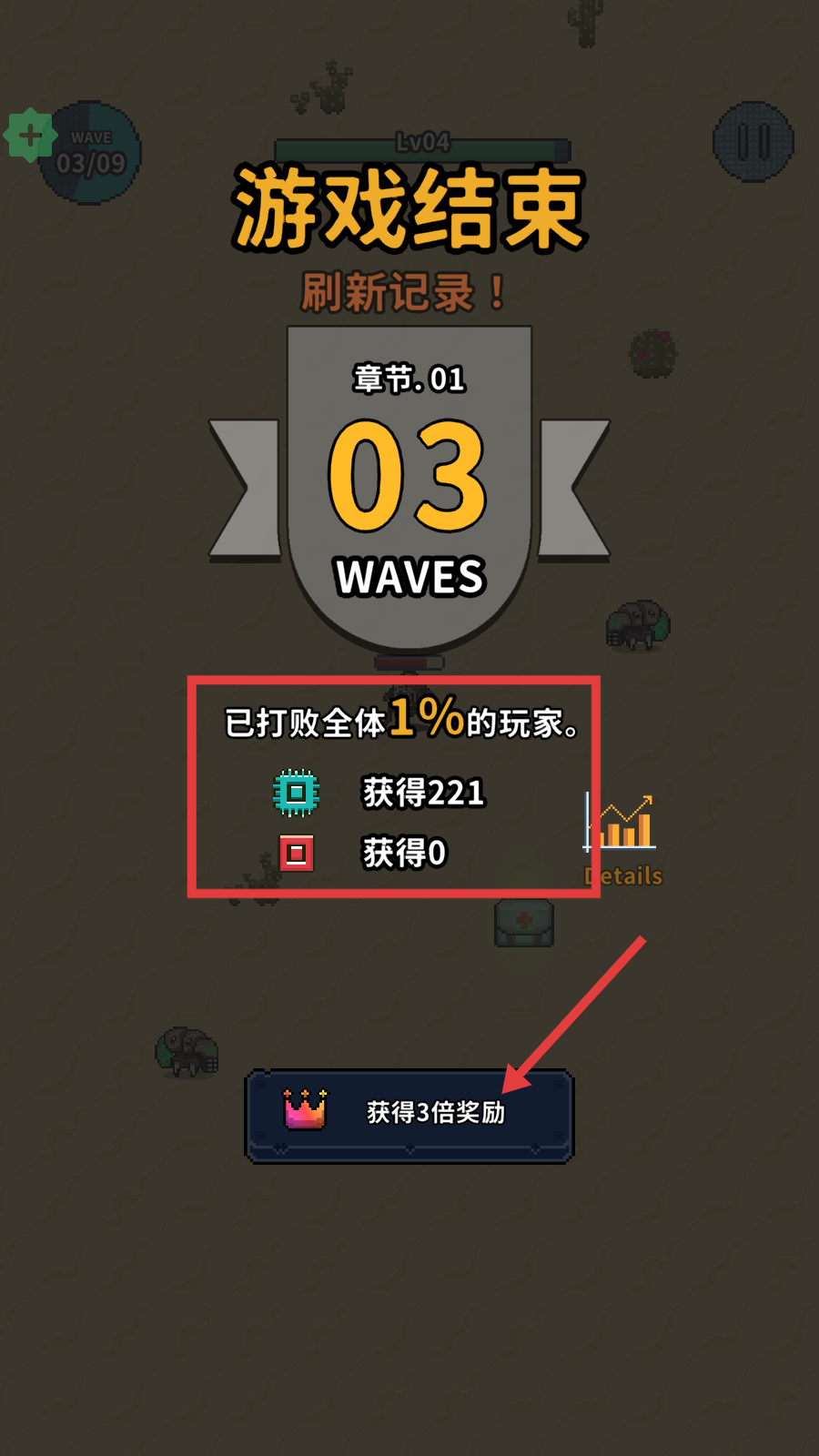 4、游戏结束后查看结算,关注【已打败全体1%-的玩家】和资源获取,点击【获得3倍奖励】可最大化收益。