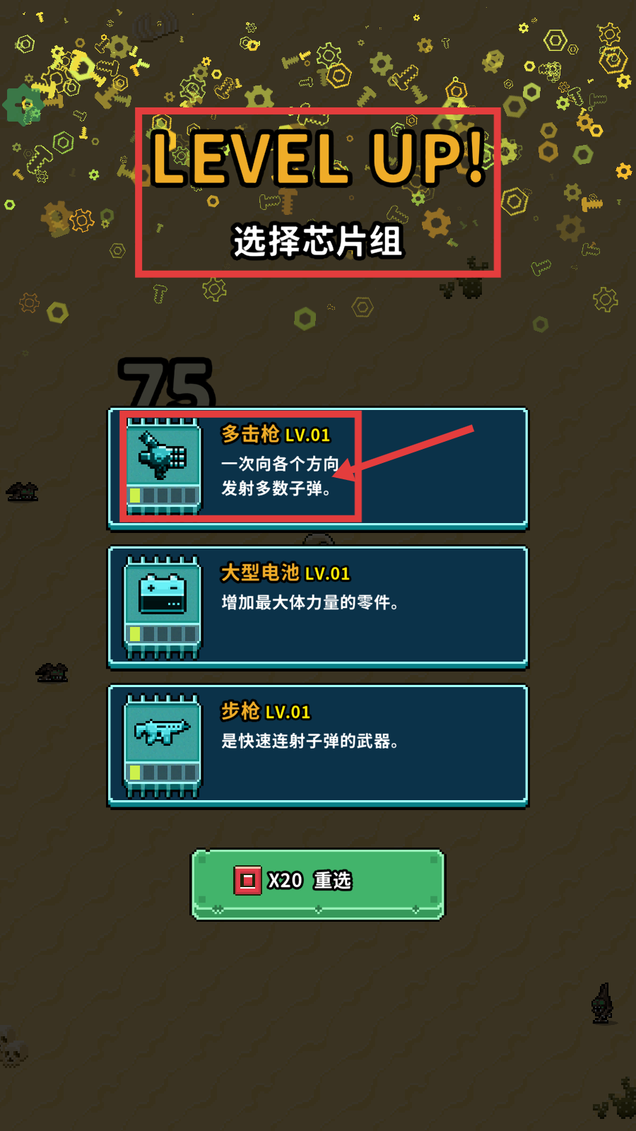 2、升级时出现【LEVEL-UP!】界面,优先选择【多击枪-LV.01】这类范围攻击芯片,提升清怪效率。