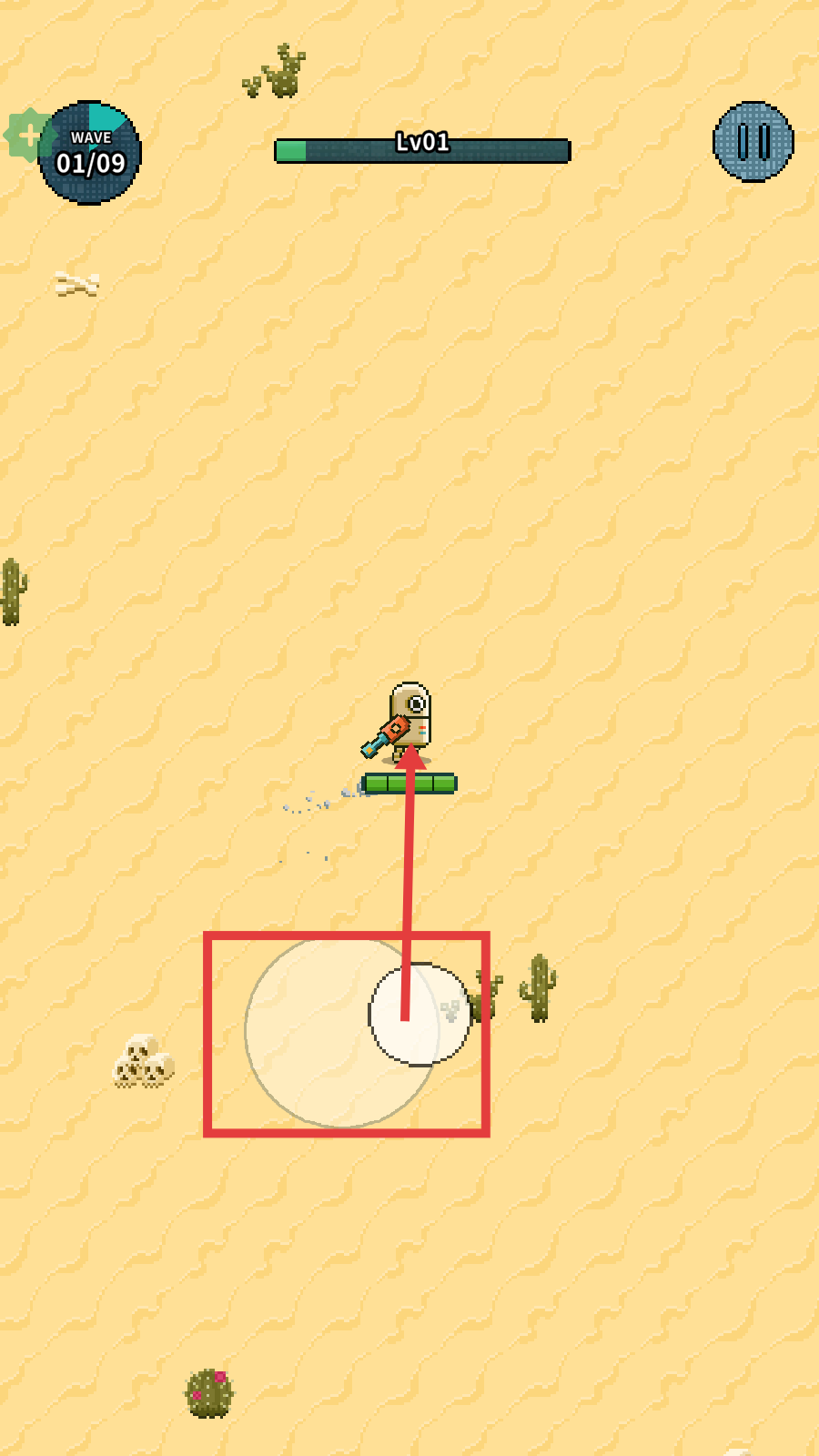 1、关注【WAVE-01/09】进度,通过下方操作区域控制角色移动,在沙漠场景中躲避障碍并准备迎敌。