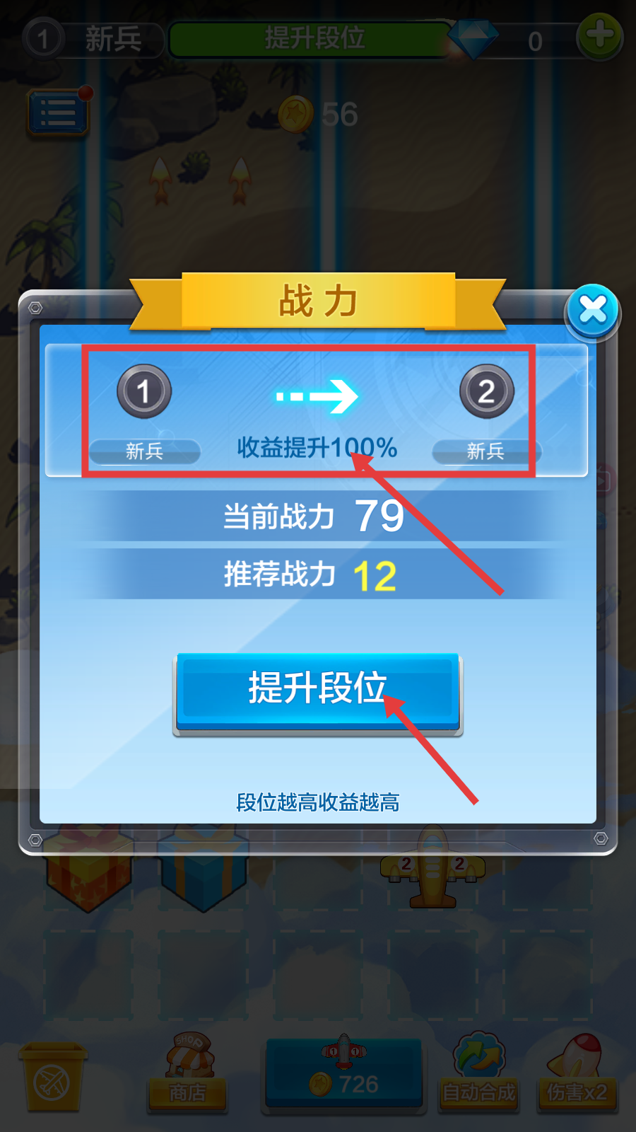 4、战力达标时点击【提升段位】,从新兵1段升至2段,收益提升100%,获取更高奖励。