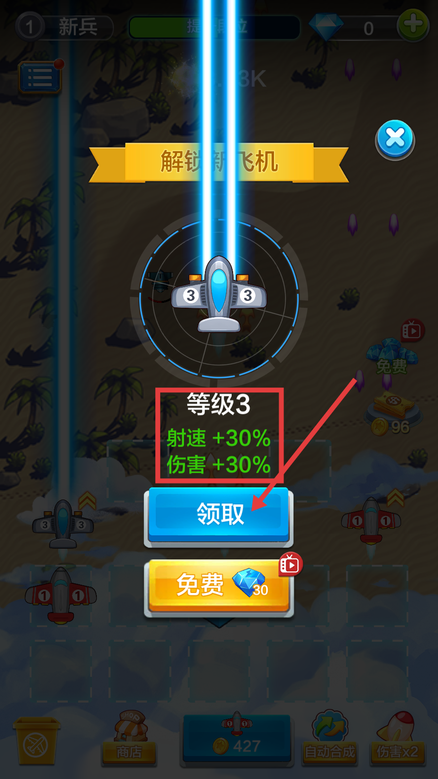 3、解锁【等级3】飞机后,其射速+30%、伤害+30%,点击【领取】按钮,强化战机属性。