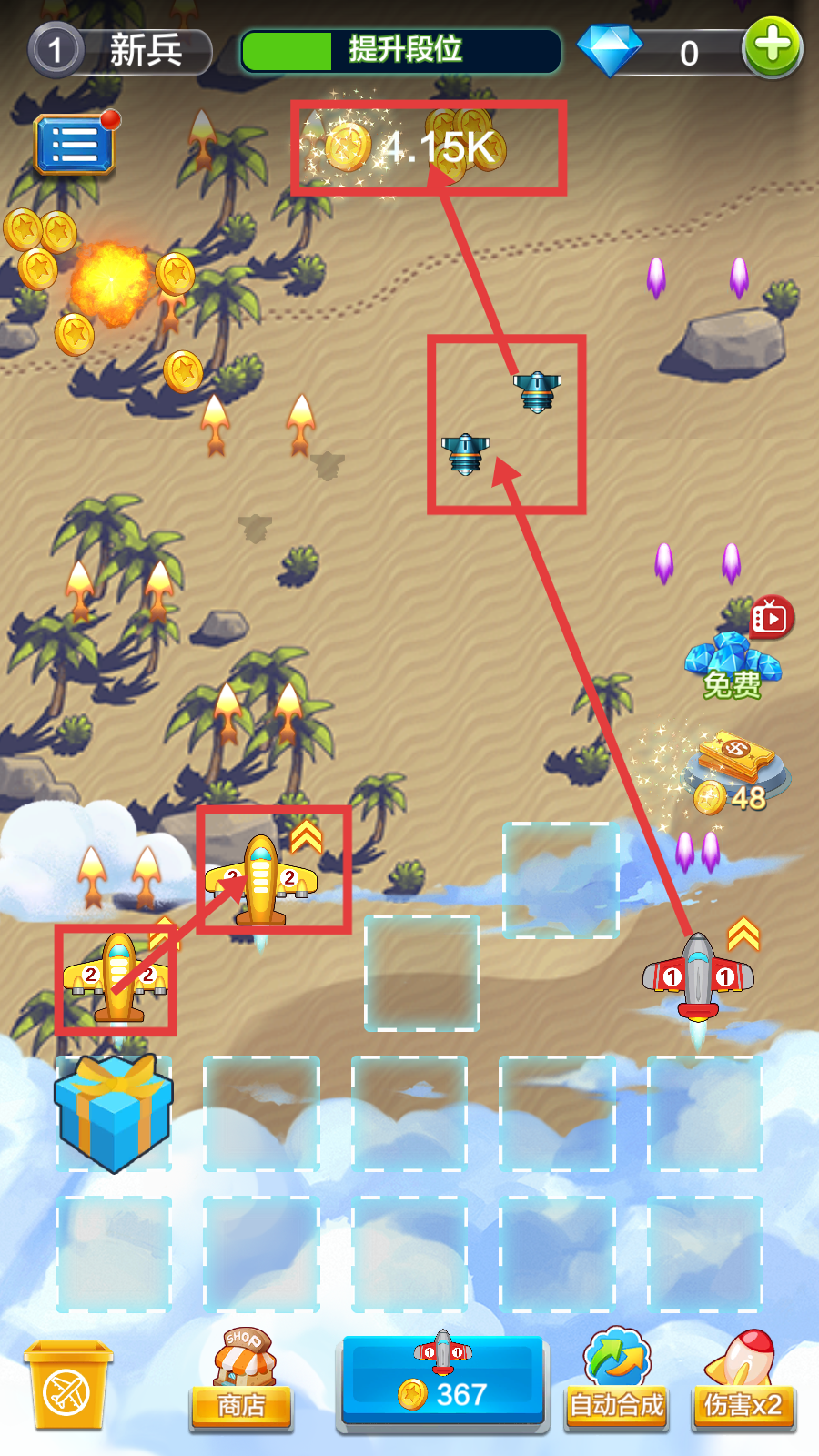 2、将相同等级的飞机如【2-2】合成,同时获取【4.15K】金币,提升收益与战斗能力。