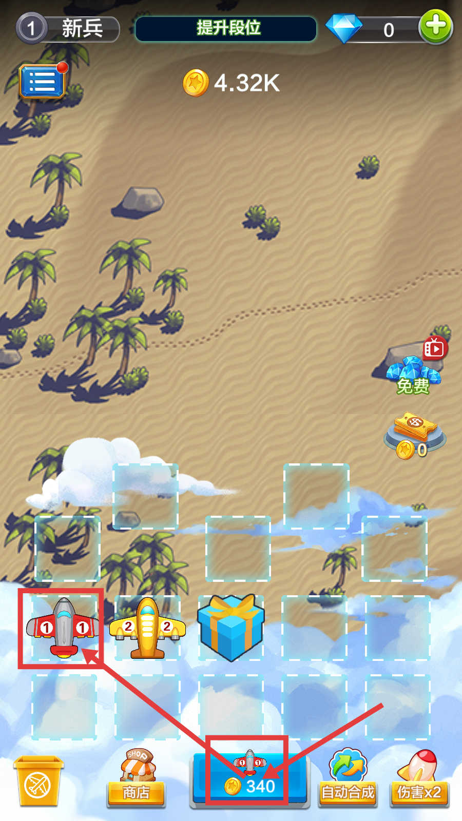 1、点击带有【1-1】标识的飞机,再点击下方【340】金币按钮,积累资源用于后续飞机合成与升级。