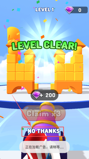 4、最后,完成关卡后点击“NO THANKS”跳过广告或点击“Claim”领取奖励。