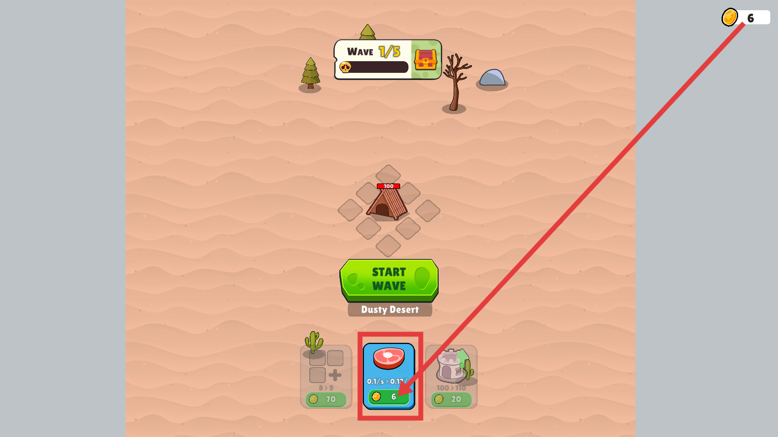 1、在【Dusty-Desert】场景中,关注肉资源【0.1/s>0.1/s-6】,积累资源后点击【START-WAVE】开启第1/5波战斗。