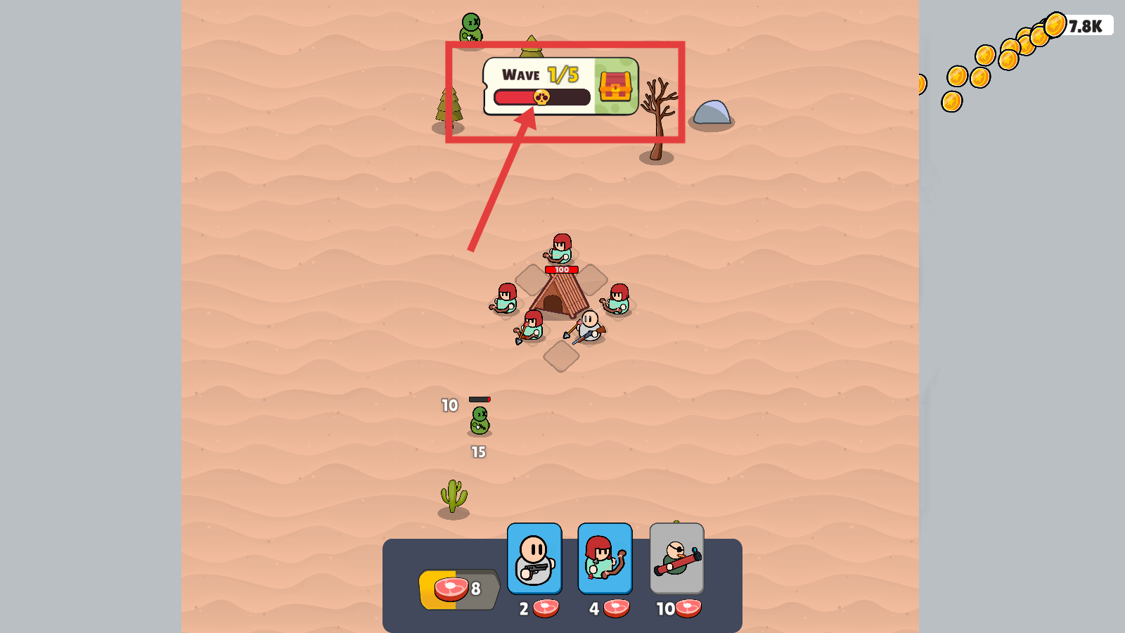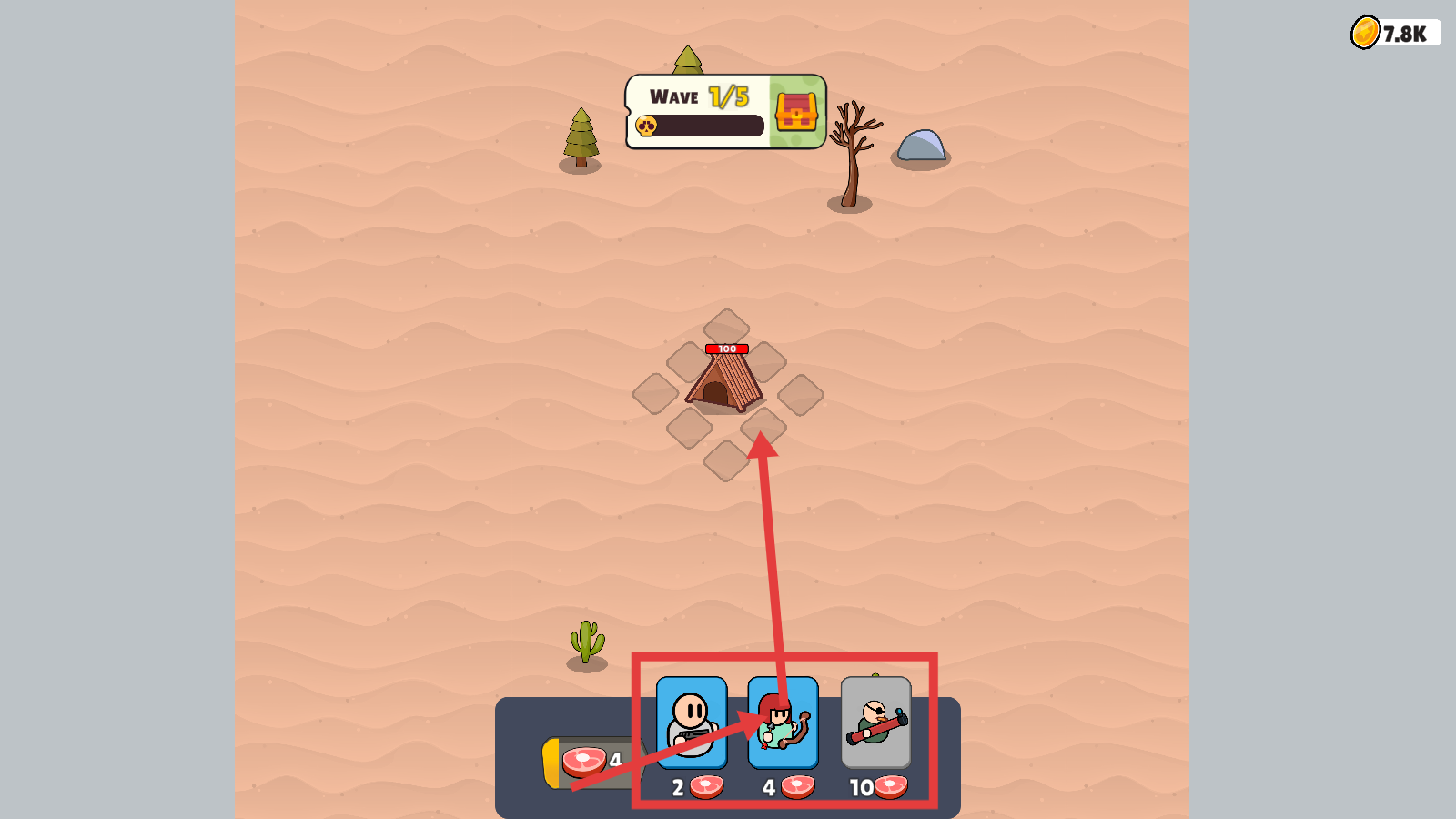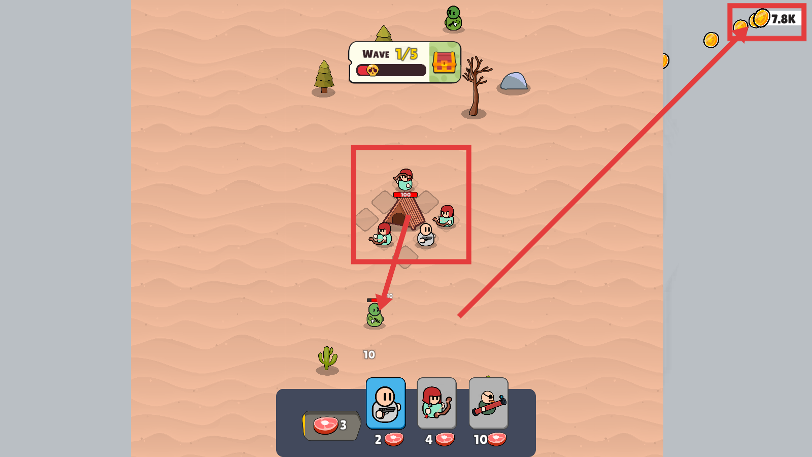 3、战斗时击败敌人,积累【7.8K-金币】资源,用于强化或召唤更多角色,提升防御能力。