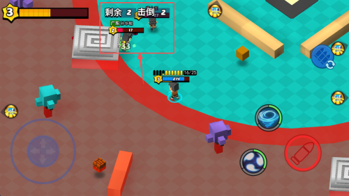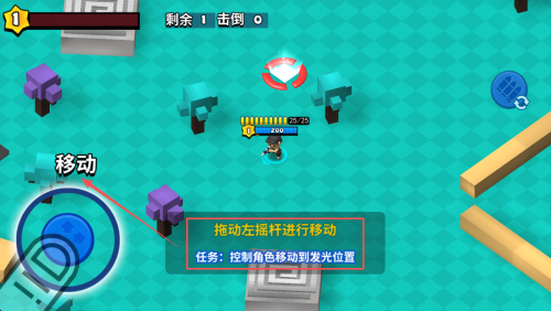 1、用摇杆控移动:进入游戏后,通过虚拟摇杆控制方块人主角移动,调整位置避开危险,找准角度瞄准敌人。