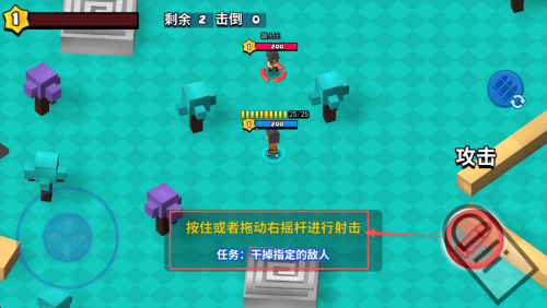 2、如何进行攻击:按住或拖动右侧的虚拟摇杆进行射击,击败指定的敌人以完成任务。