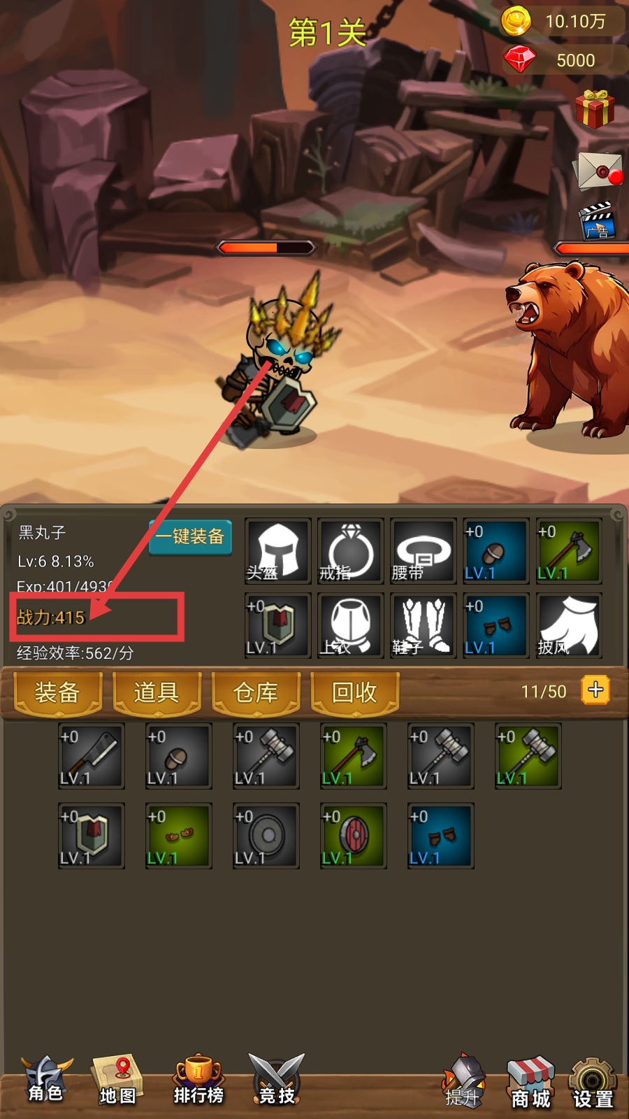4、更换装备后,角色【战力】从369提升至415,战力提升可提高打怪效率,助力关卡推进。