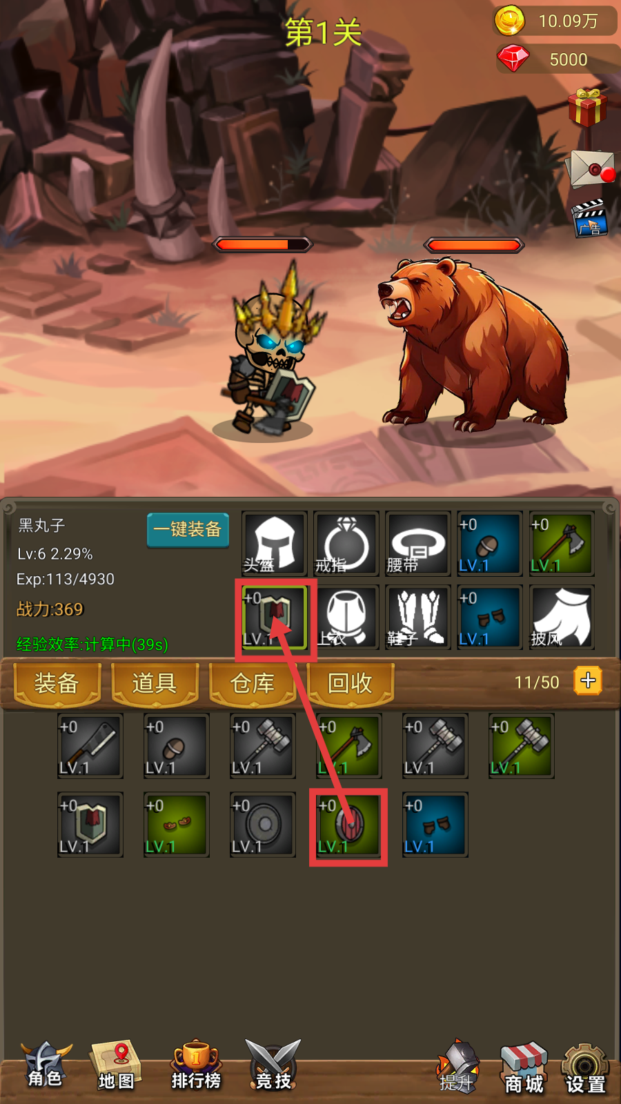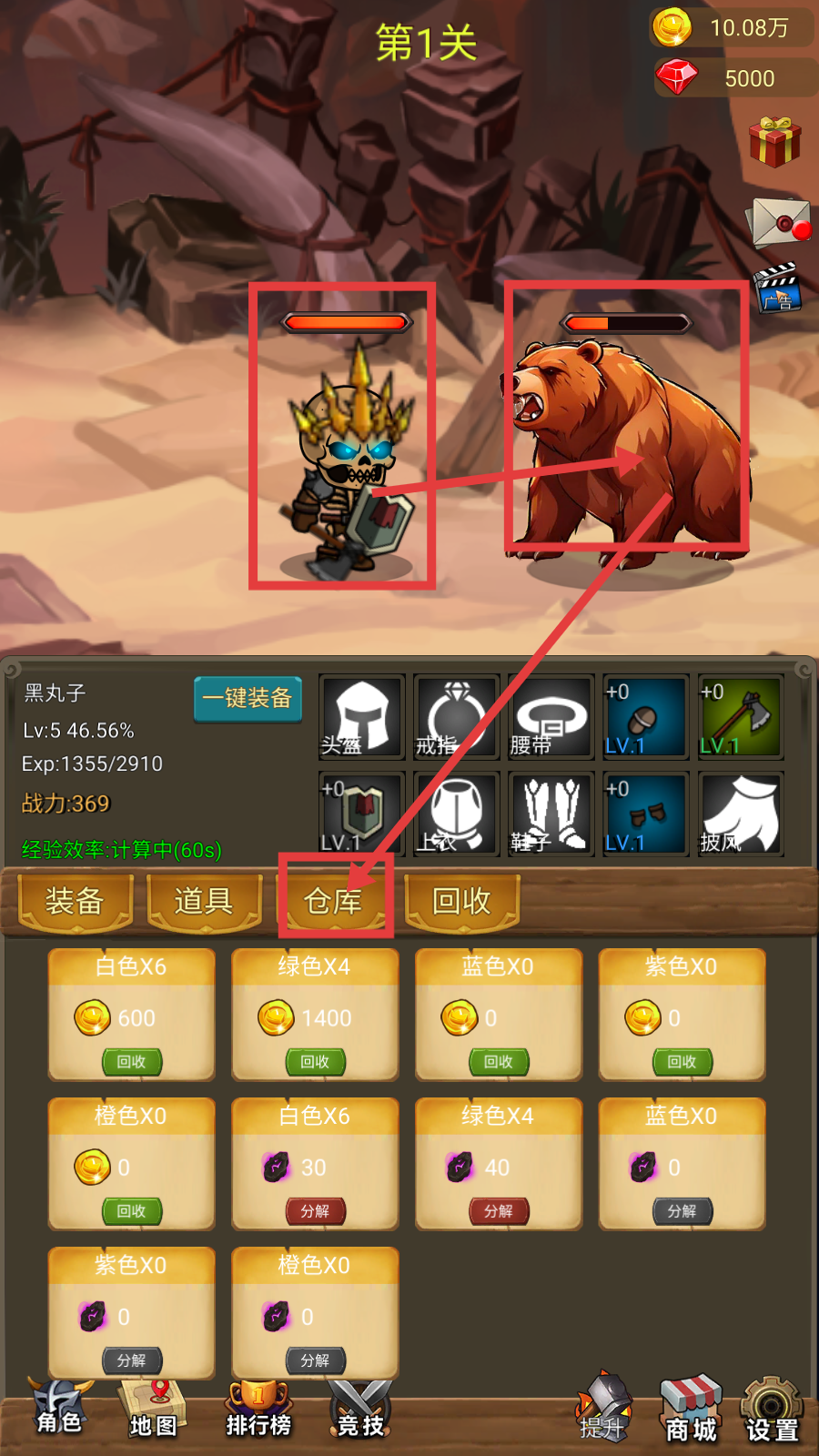 2、在【第1关】操控角色与棕熊战斗,利用【仓库】管理装备资源,为战斗提供支持。
