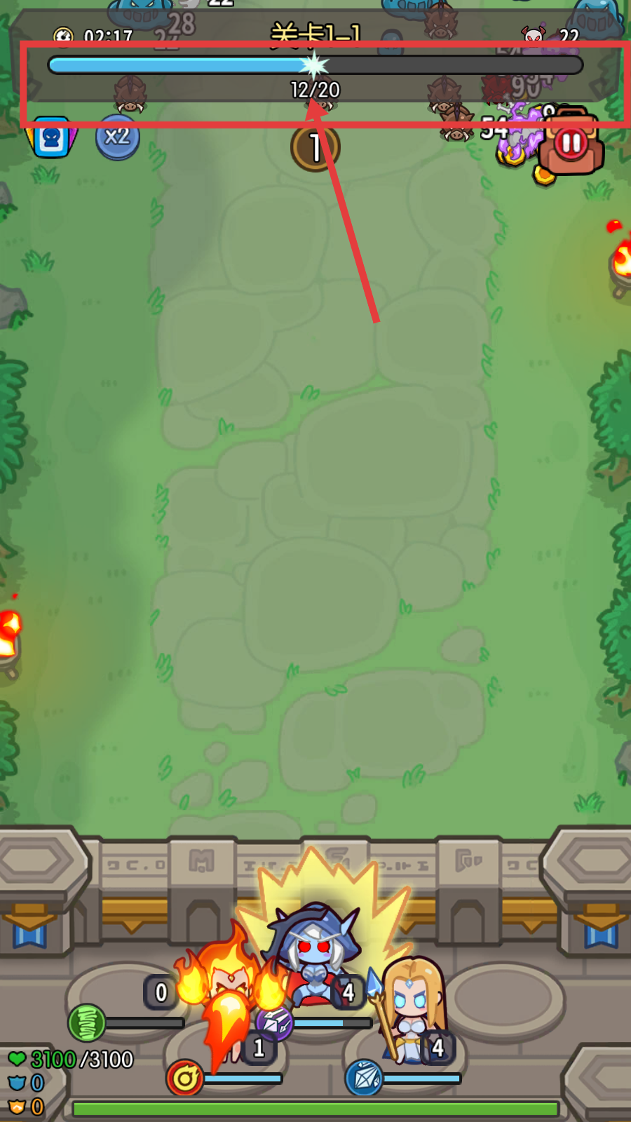 4、关注【关卡1-1】进度条,持续战斗推进至20/20,完成关卡挑战。