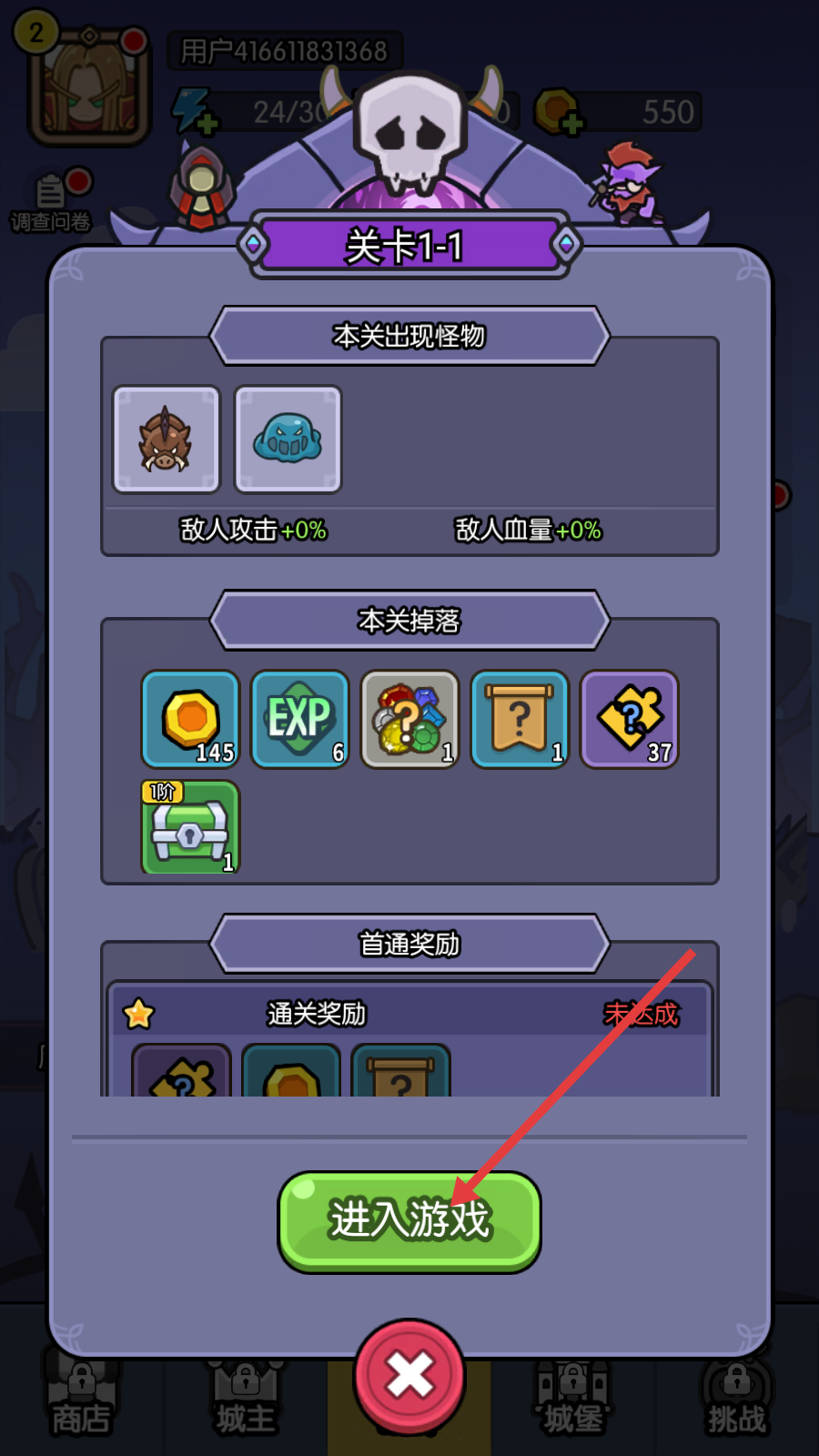 1、点击【关卡1-1】的【进入游戏】按钮,了解本关怪物与掉落,开启战斗征程。