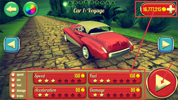1、升级赛车【Speed-150】【Fuel-150】【Acceleration-90】【Damage-90】属性,利用金币提升性能后点击红色启动按钮开启赛程。