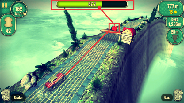 2、比赛中关注绿色进度条,操控赛车收集红色道具,助力赛程推进至【87.2】进度。